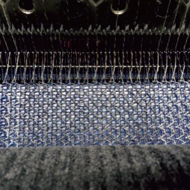 ラッセル編み機でイチテキの生地が編まれる様子。多くの経糸を平行に並べ、左右に絡ませながら縦方向に編み目を作っていきます。