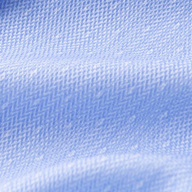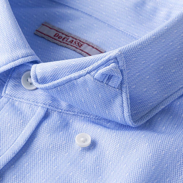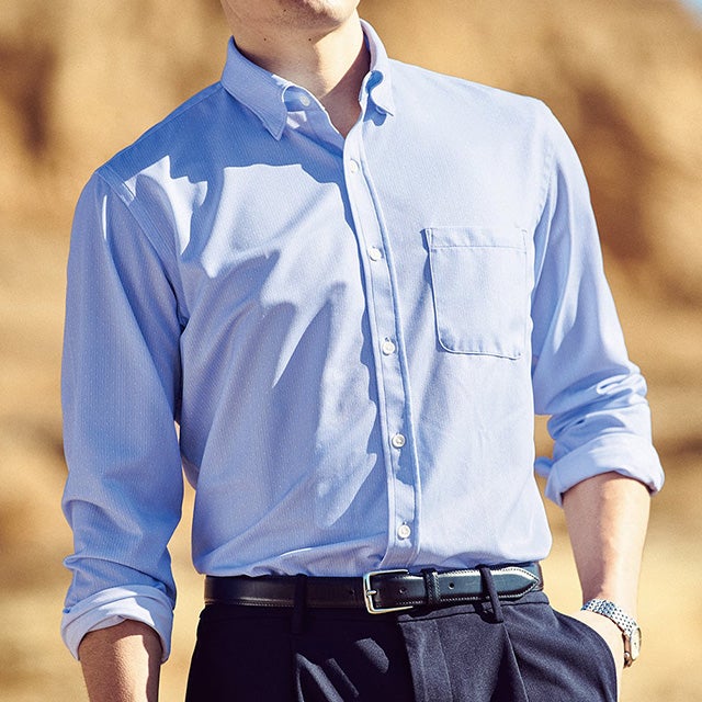 衿先裏に隠しボタンがついたボタンダウン。留めるとボタンが見えず、立体的に衿が立ちます。ボタンが見えないことでカジュアル感を抑えた印象になります。