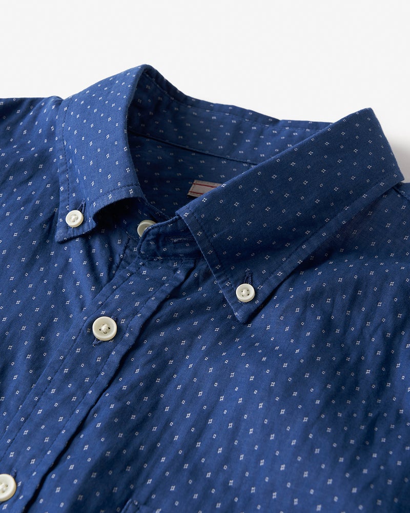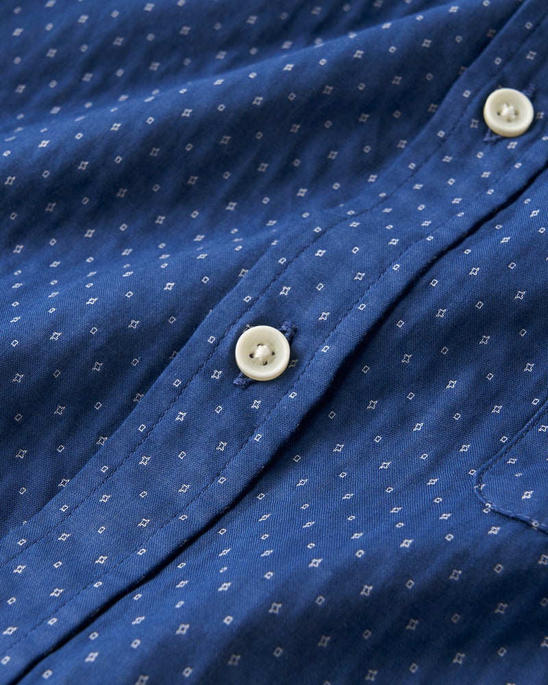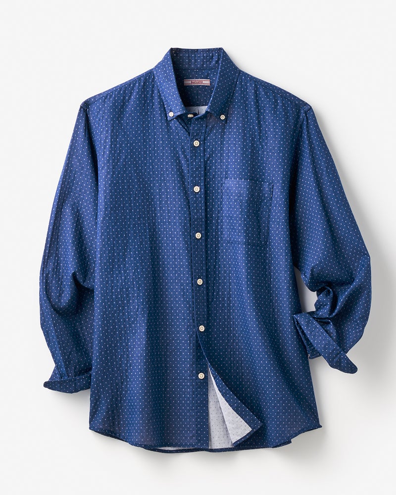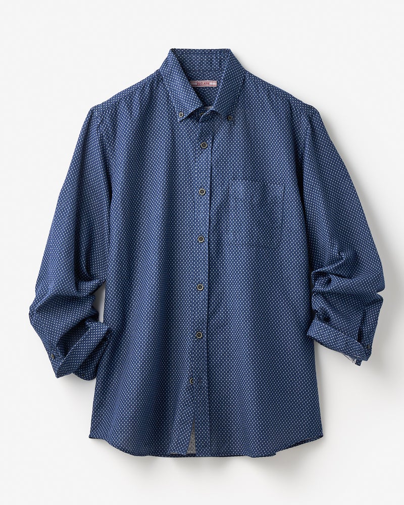 細かなドビー柄を全面に配したシャツで、色によって柄が微妙に異なります。綿100%のナチュラルな風合い。二重織りの生地の間に空気を含む、ふんわり柔らかな着心地です。
