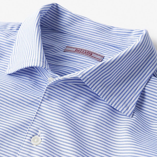 衿はオープンカラー。シャツの前端を内側に折り返した上品なフレンチフロント。粋な遊び心のあるシャツです。