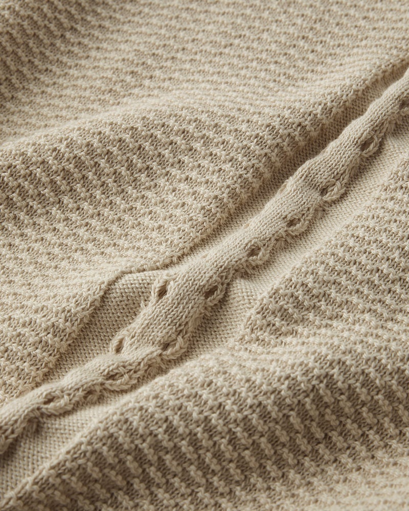 立体感のある編み地はほどよく伸びて快適。シワになりにくく速乾性もあります。