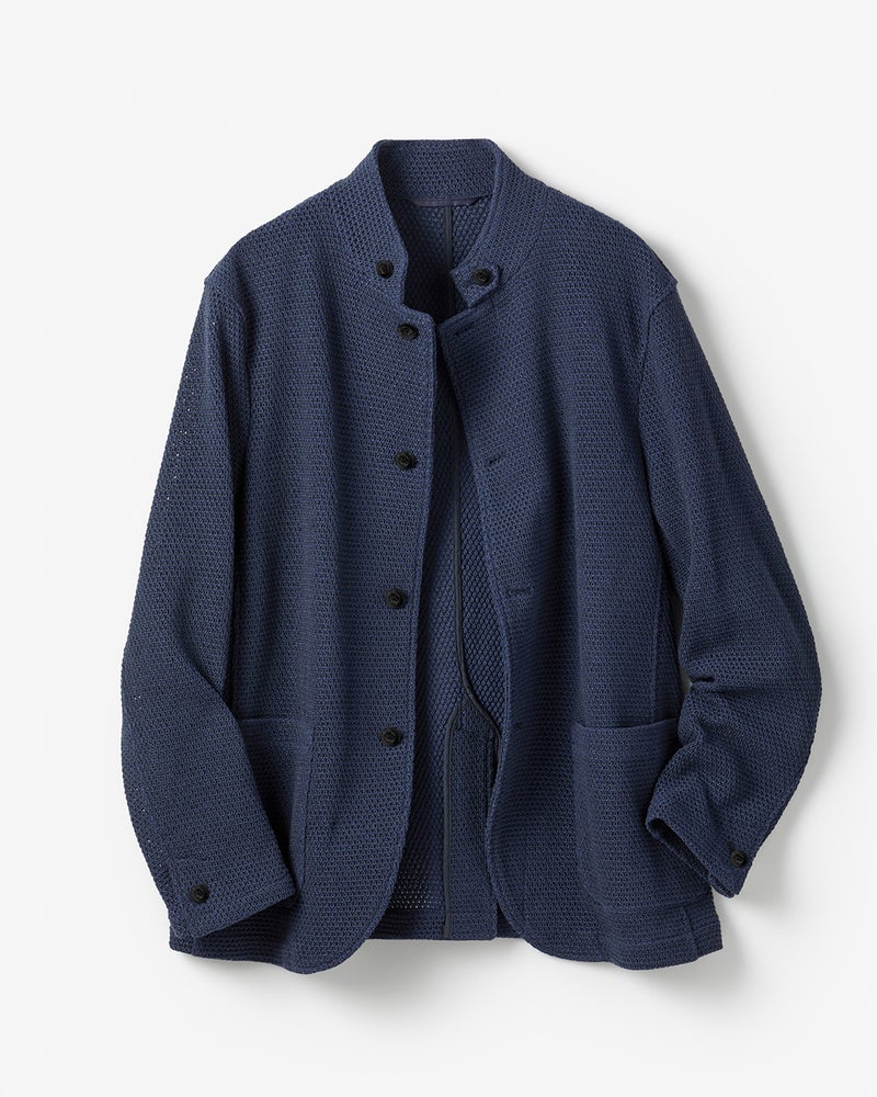 • 凹凸が醸し出す味わいのある編み目のラッセル編みジャケット。ラッセル編み機を使ってタテ編みにすることで、丸編みに比べてハリが出るため、型くずれしにくく丈夫です。