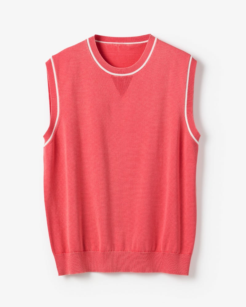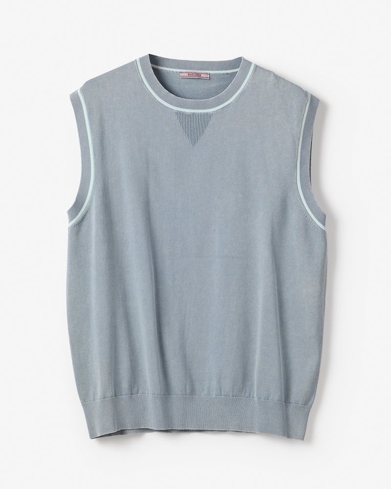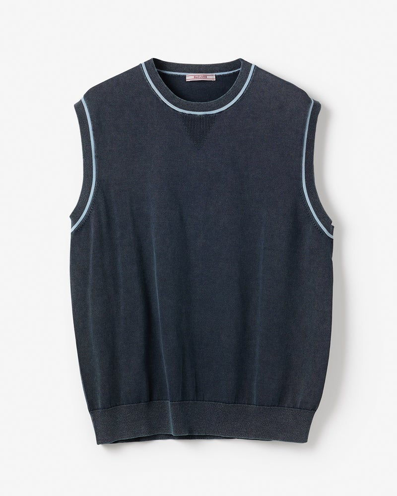 ヴィンテージ風の独特な風合いを生みだすアシッドウォッシュ加工を施し、大人らしい味わいのある表情に仕上げたベスト。衿とアームホールにはライン配色を効かせて爽やかに。シャツともTシャツとも好相性です。