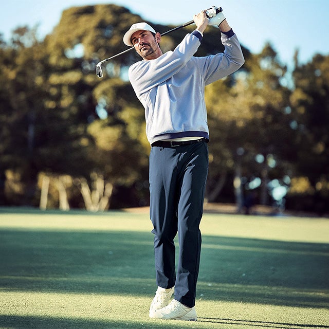 360°しっかり伸びて、しゃがむ、歩く、振り切るといったゴルフのあらゆる動きに対応します。