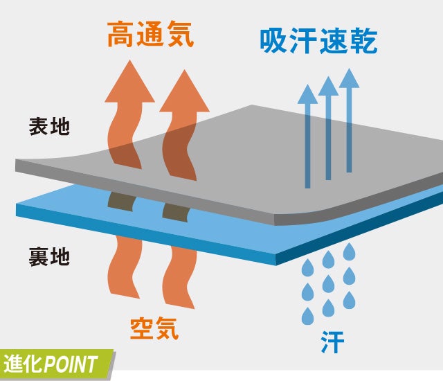 空気がよく通る構造に進化。高い通気性を備え、ムレにくく熱がこもりにくい。吸汗速乾性も加わり、汗がすぐ乾きドライな状態をキープします。
