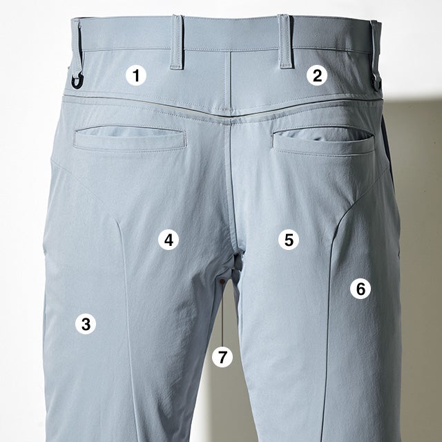 後ろは切り替えを多用した、通常の4枚より多い7枚パーツ(切り替え)の立体構造。体のラインに立体的に沿うから、すっきり見えて、ゴルフ中はもちろん、日常の動きも快適です。