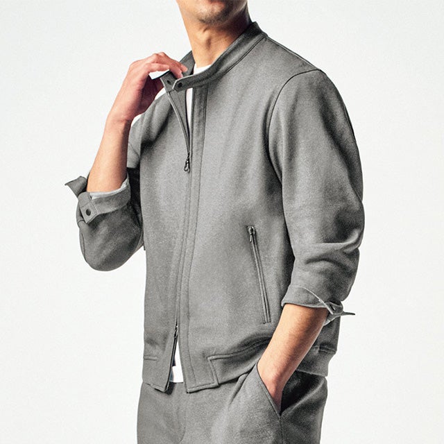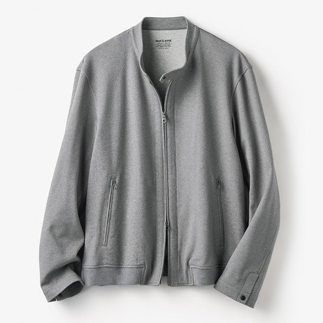 ライダース風のジャケットは、すっきりシルエットで、衿は首に添って立つ設計です。T800と呼ばれる弾力性と耐久性を兼ね備えた糸で作った革新的な生地を採用。360°伸縮して、吸汗速乾性にも優れています。