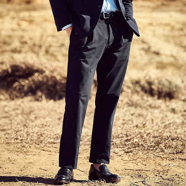• 正統派スラックスに見えるのに、360°自在に伸びる「楽スラックス」。T800と呼ばれる糸を使い、摩擦や洗濯に強く、型くずれしにくい生地に進化。5cm高く設定した膝位置から裾にかけてテーパードさせた、すっきり脚長シルエット。腰周りゆったりのワンタックです。