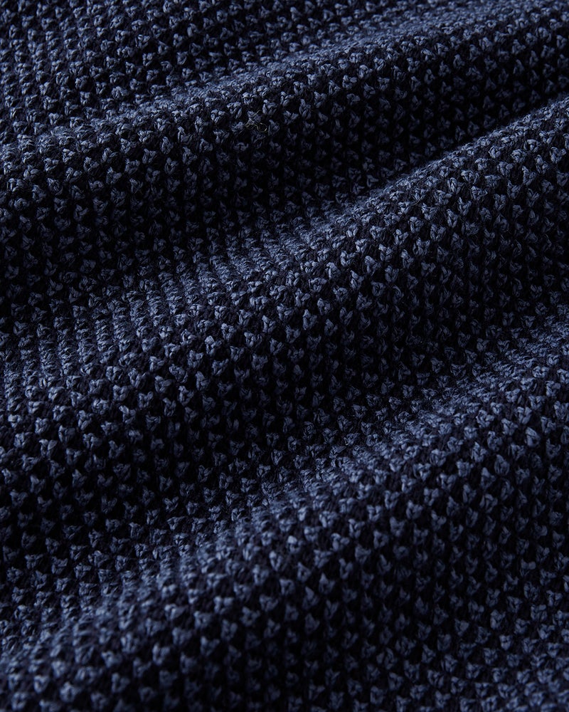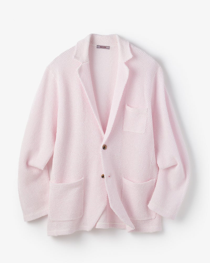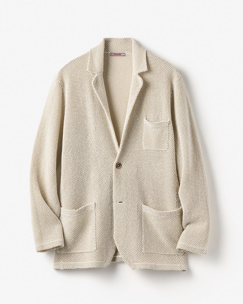 和紙ブレンドの生地を使った鹿の子編みジャケット。テーラードのデザイン。プレーティングという技法を用いて、ハリのある型くずれしにくい品質に。ストレッチが効いていて一重仕立てだから、カーディガン感覚で羽織れます。