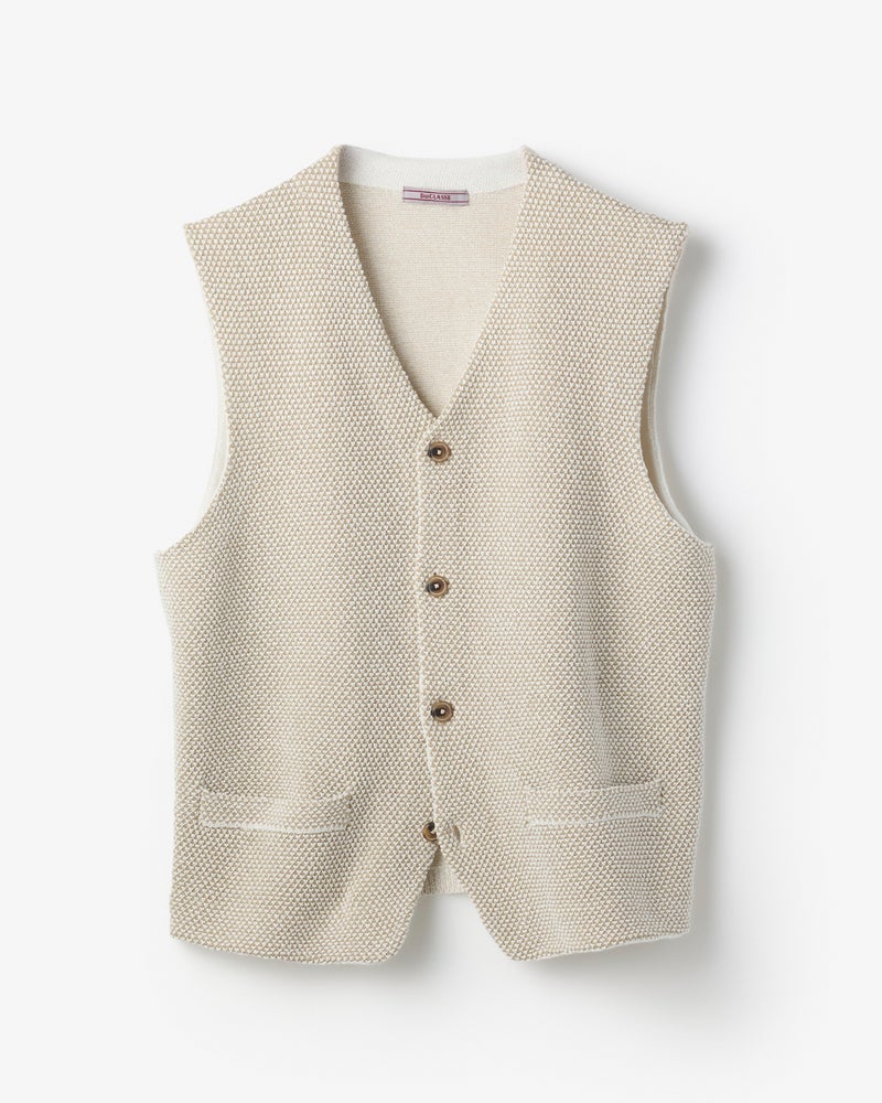 和紙39%ブレンドの生地で、前身頃は凹凸のある鹿の子に、後ろ身頃はすっきりとした天竺に編み上げたニットジレ。さらりとした肌触り。シャツともTシャツとも相性がよく、ジャケットの中に着れば、絶妙なアクセントになります。