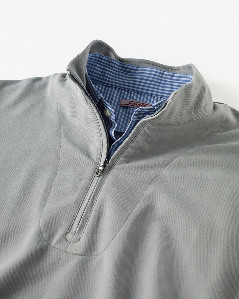 ハーフジップの衿の中に、ストライプのシャツ衿と前立てをセットし、フェイクレイヤードに仕上げました。1枚着るだけで重ね着が完成。本体はストレッチが効いた軽量ジャージ。快適でのびやかな着心地です。