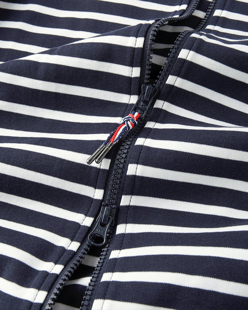 フロントファスナーのトリコロールの引き手が、さりげないアクセントに。