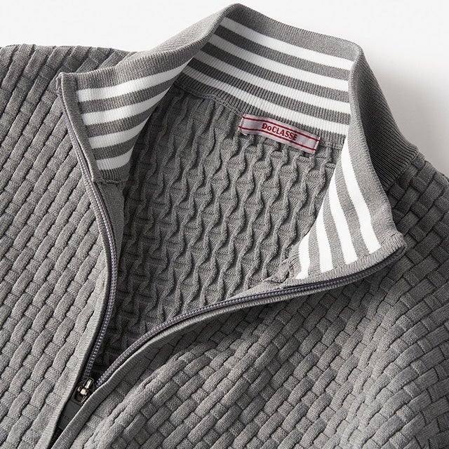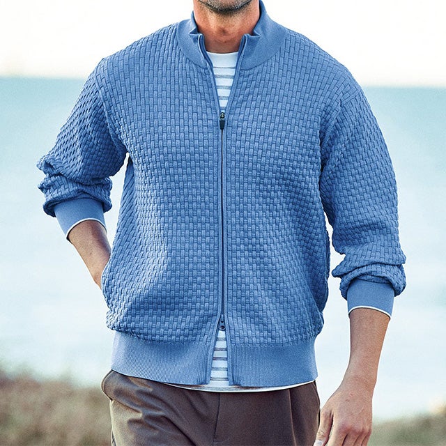 独特な凹凸感のある編み地が魅力のバスケット編みフルジップ。