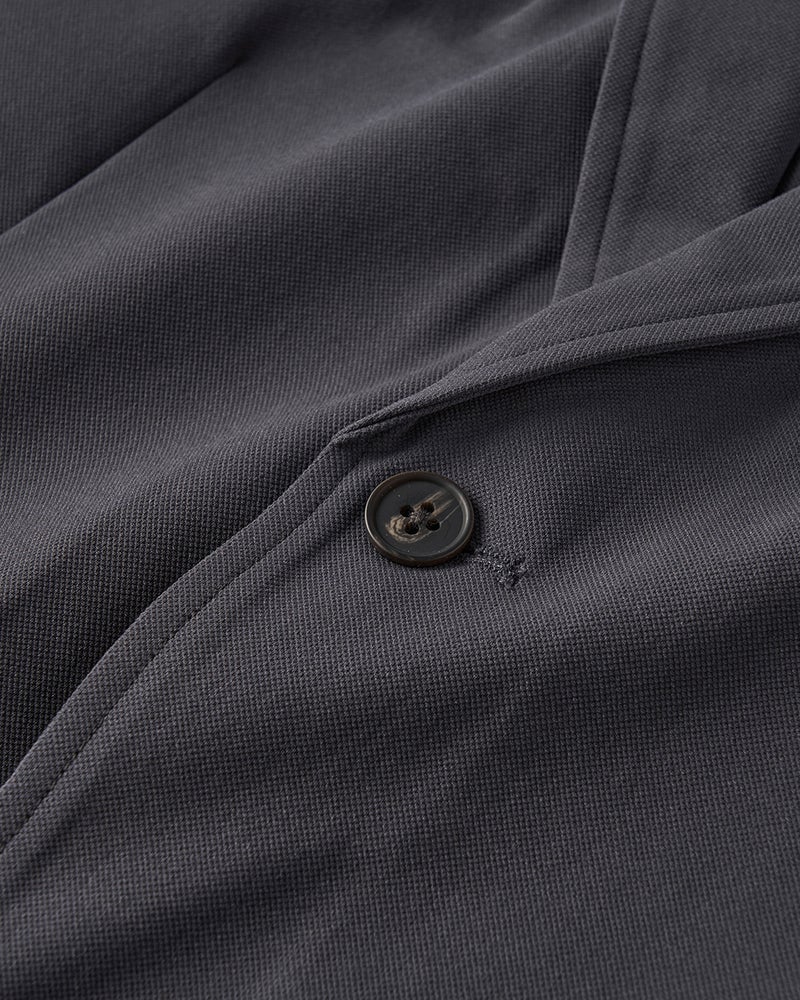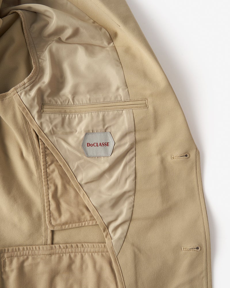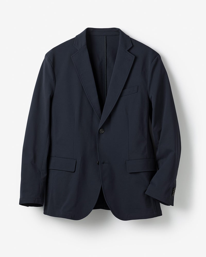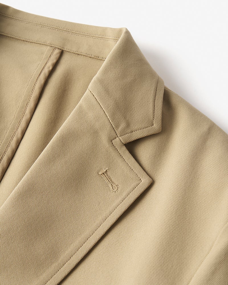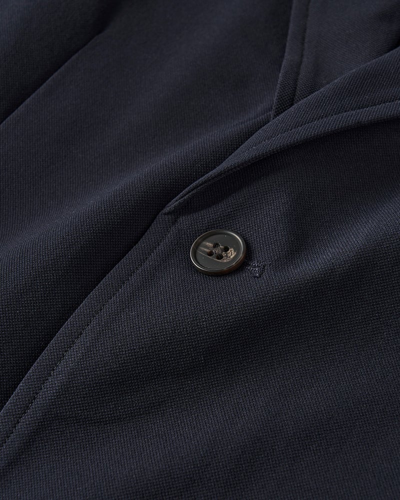 細かな鹿の子ジャージ生地は360°ストレッチ。T800と呼ばれる糸を使った、弾力性と弾力回復性、耐久性を兼ね備えた、ドゥクラッセ独自の生地です。摩擦や洗濯に強く、型くずれしにくい。すっきり見えるシルエット。軽量なアンコン仕立てだから、仕事でも休日でも軽く羽織れます。