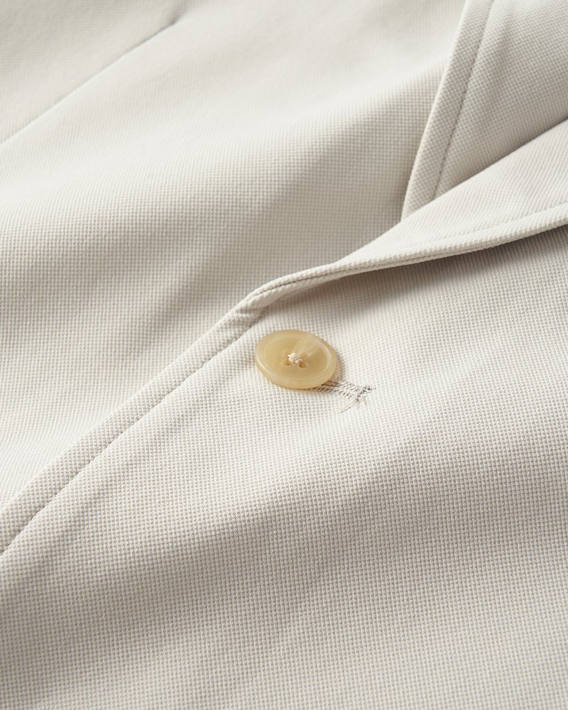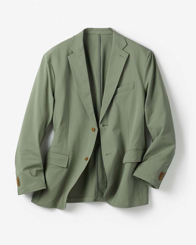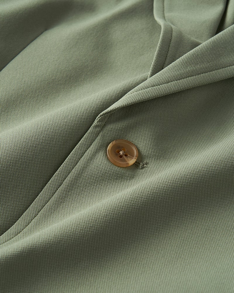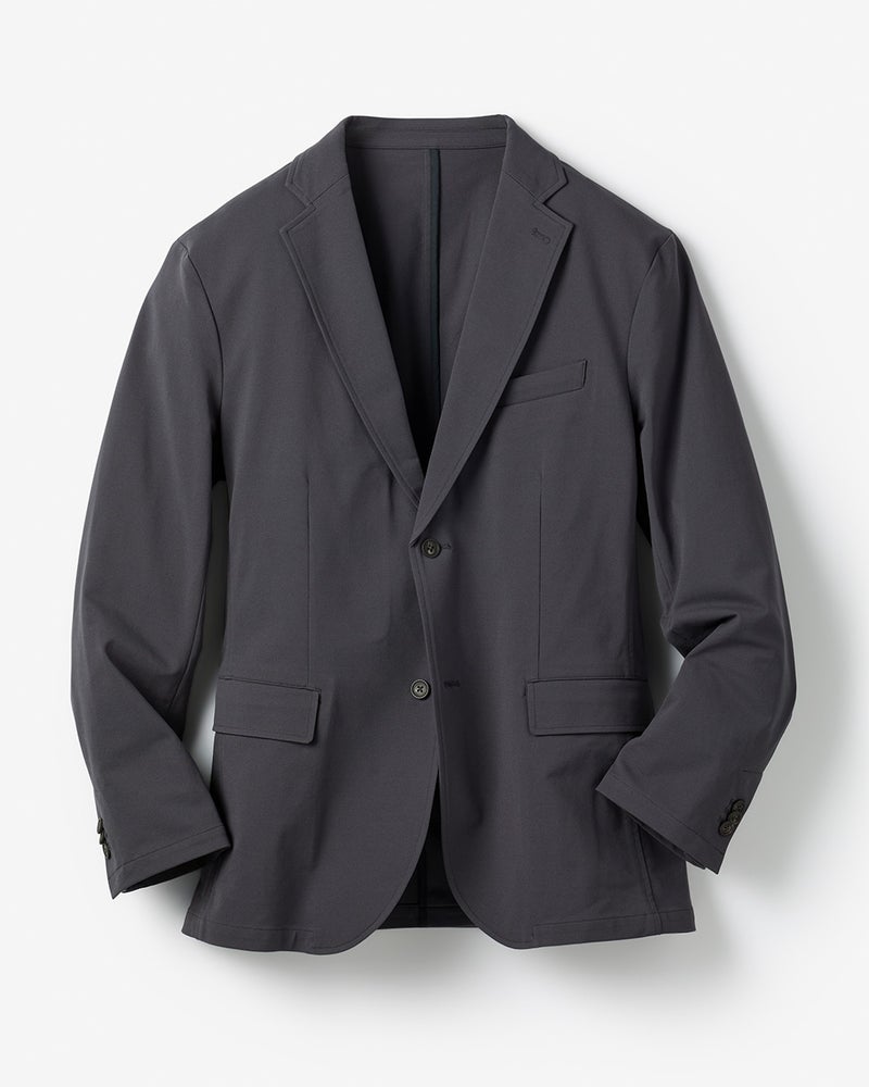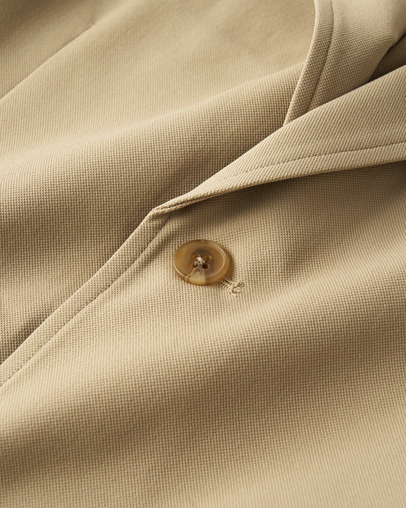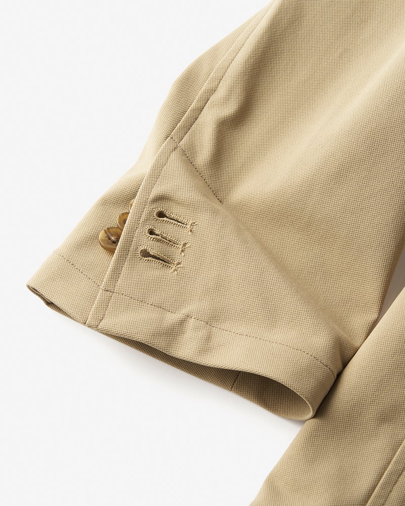 細かな鹿の子ジャージ生地は360°ストレッチ。T800と呼ばれる糸を使った、弾力性と弾力回復性、耐久性を兼ね備えた、ドゥクラッセ独自の生地です。摩擦や洗濯に強く、型くずれしにくい。すっきり見えるシルエット。軽量なアンコン仕立てだから、仕事でも休日でも軽く羽織れます。