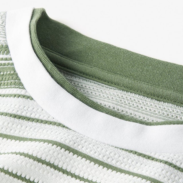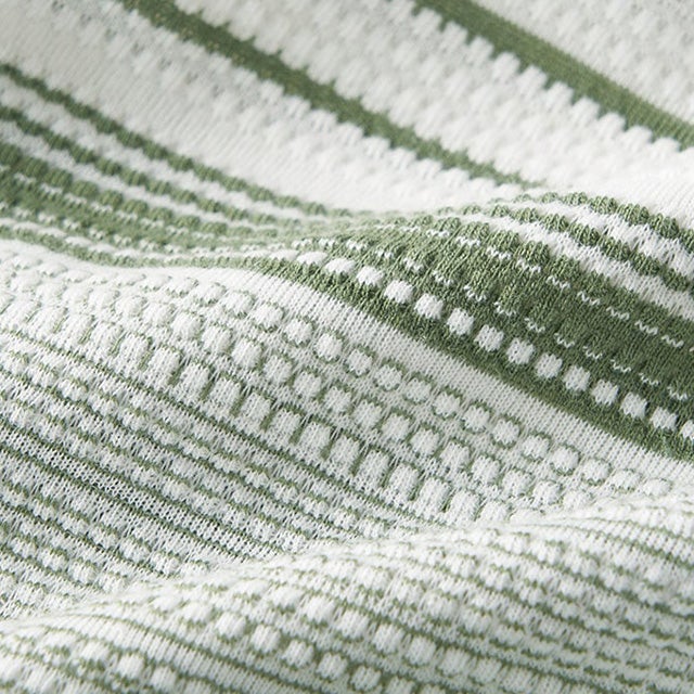 凹凸感のあるポップコーン編みとタック編みを交互に組み合わせたパネルボーダー生地。柔らかく、サラッとした肌触りです。
