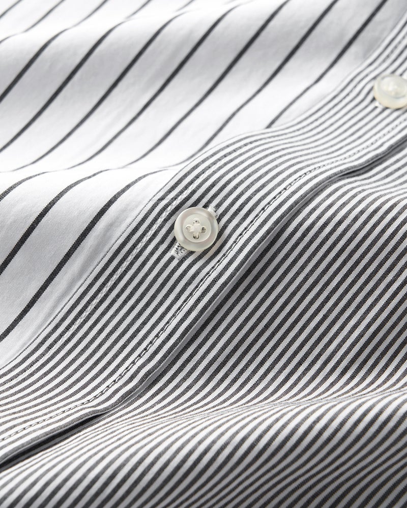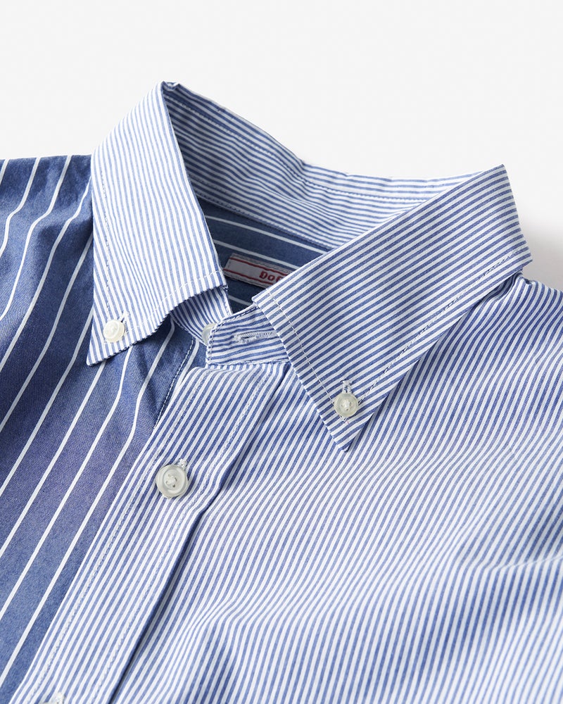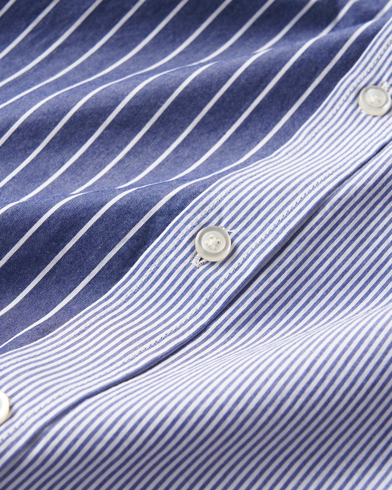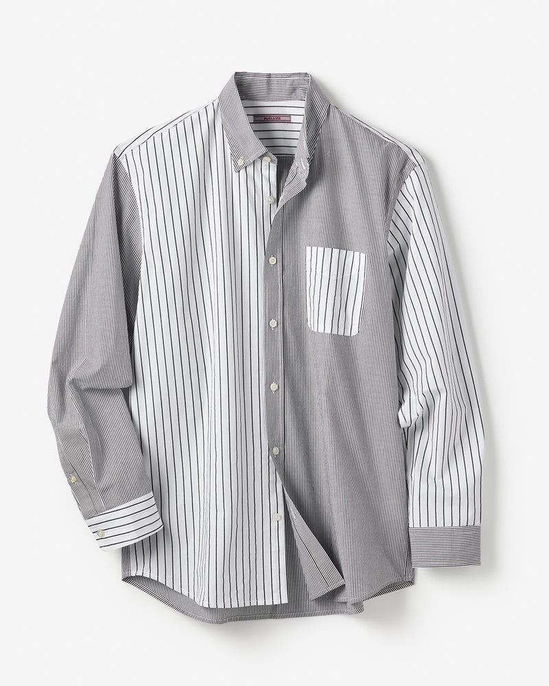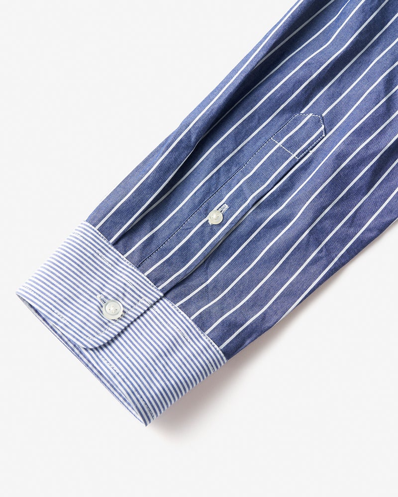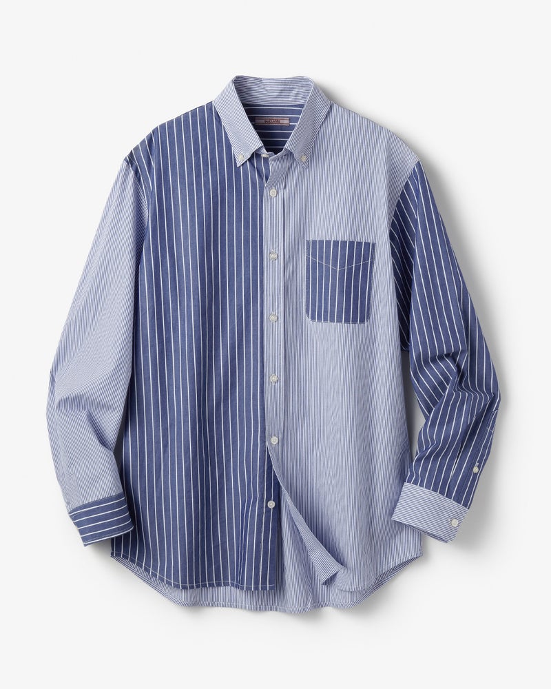 2種類のストライプ柄を切り替えた個性的なシャツ。ほどよいハリがある綿100%のブロード生地。同色系ストライプの組み合わせだから、派手すぎず上品な遊び心があります。