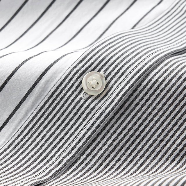 2種類のストライプ柄を切り替えた個性的なシャツ。同色系ストライプの組み合わせだから、派手すぎず上品な遊び心があります。