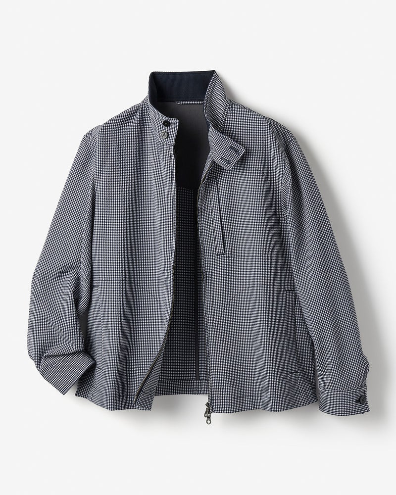 現在のブルゾンの原型といわれる名品のデザインをベースに、シアサッカー生地で爽やかに仕立てました。大人がすっきり見えるシルエット。凹凸のある組織がもたらす清涼感。吸汗速乾性もあり、抜群に動きやすい360°ストレッチです。