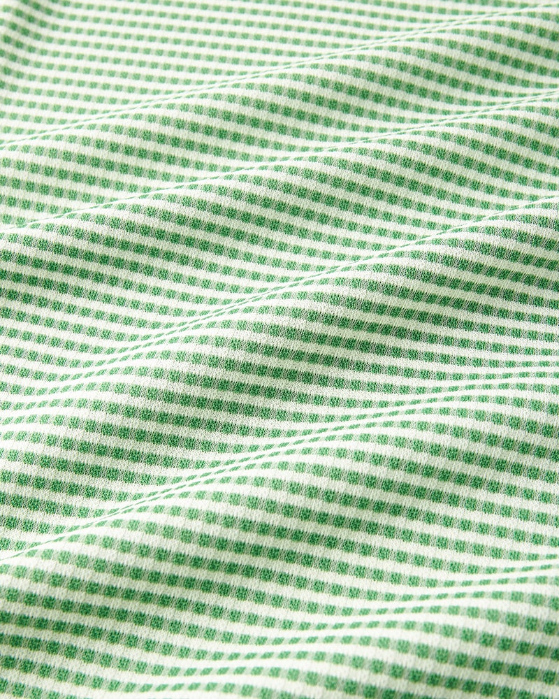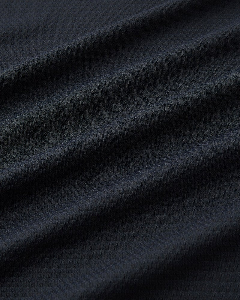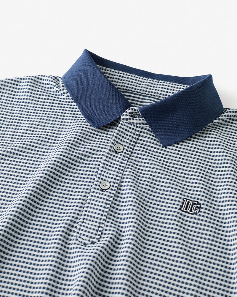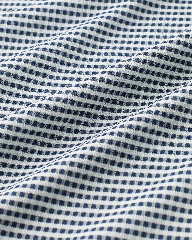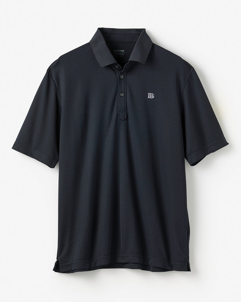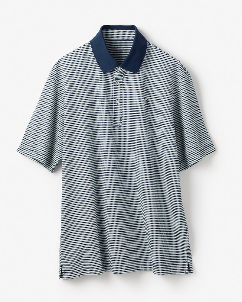 チェック柄ジャカード生地は、軽量で伸縮性に優れ、吸汗速乾、抗菌防臭、UVカット機能付き。ポロは台衿付きです。