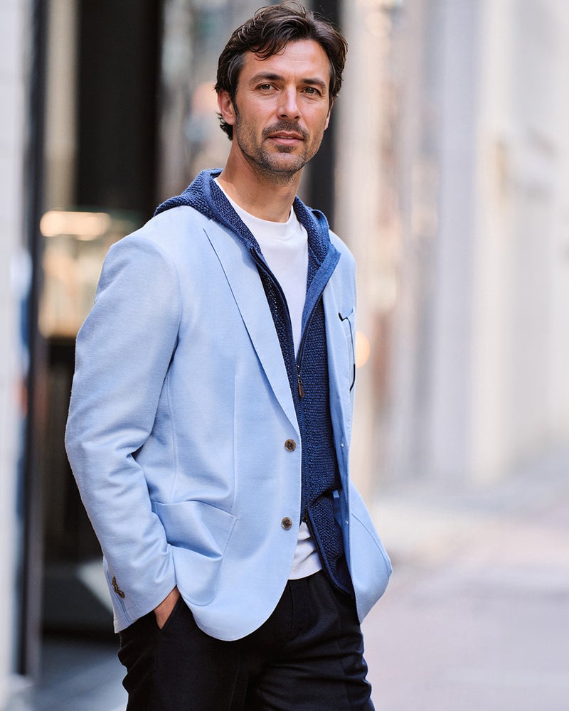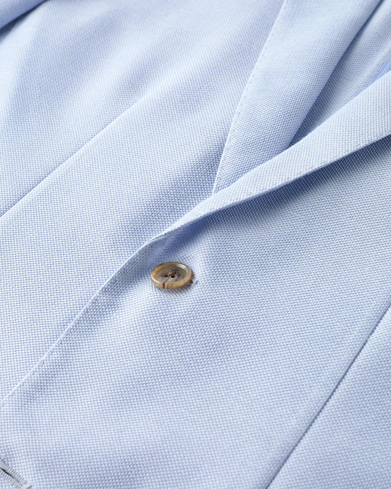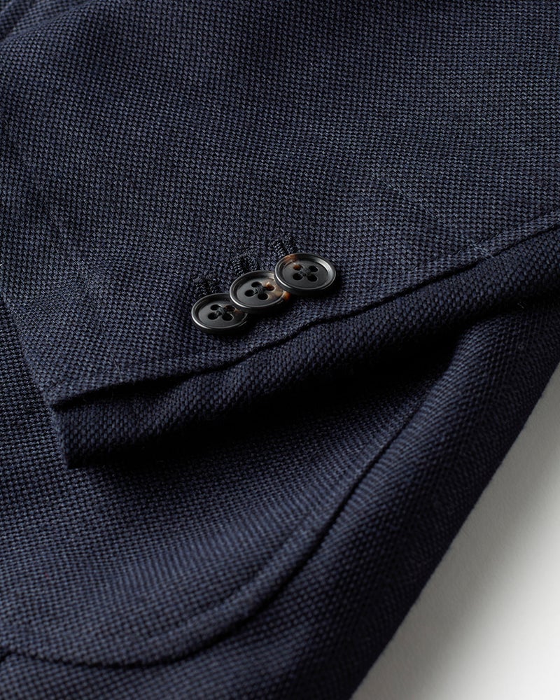 ジャケットは、すっきり見える細めのラペルで、大見返しのアンコン仕立て。袖口はボタンで開閉できる本切羽。体型別で選べるA体とAB体をご用意しました。