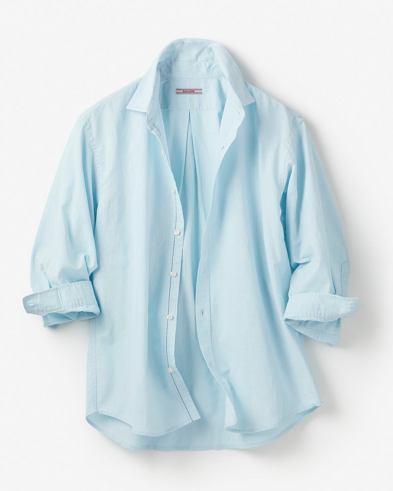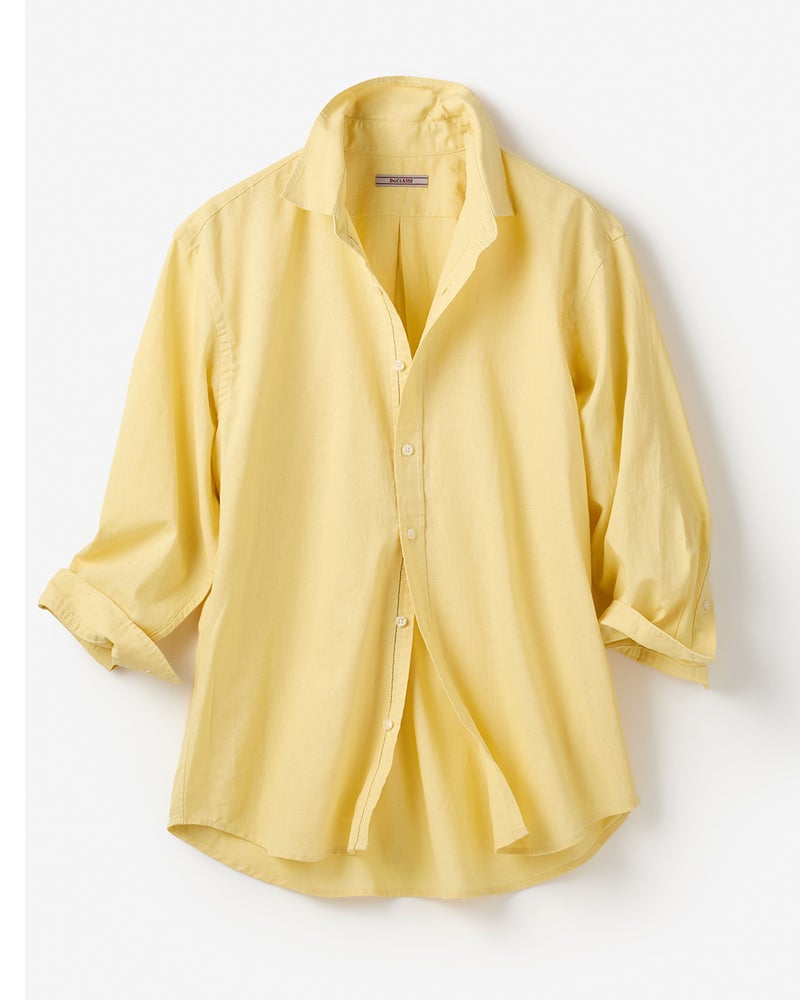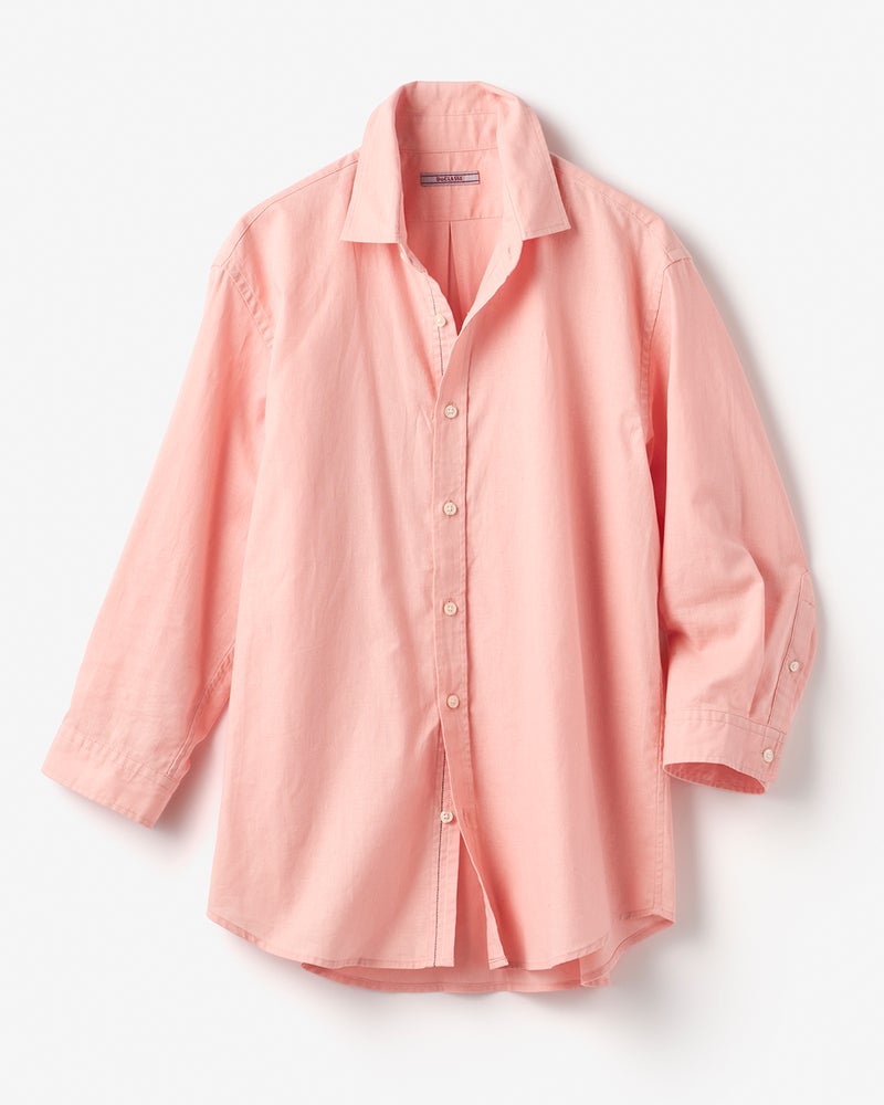 綿の柔らかさと麻の清涼感を兼ね備えた生地は、洗いをかけたソフトな感触だから、素肌に着ても気持ちいい。ゆったりシルエットで絶妙な7分袖です。衿はレギュラーカラーで型くずれしにくい。多彩なカラーが揃っています。