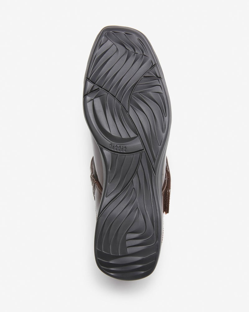 超軽量を実現するため、樹脂を発泡させたEVA素材を採用。片足約200グラムの軽量感、すぐれた耐久性や屈曲性もキープし、軽さと強さを実現しました。脚のカーブに沿ったアシンメトリーなデザインが、どの角度から見ても足をほっそり、きれいに見せてくれます。太めのベルトはタイツや靴下との相性も良く、デイリーユースに大活躍します。