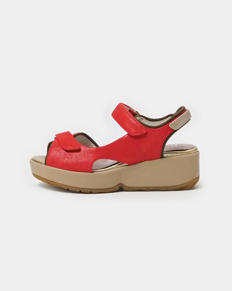 3点調節可能な新・厚底サンダルが新登場♪ 脚長6cmですっきり美脚、実感ヒール2.5cmで安定感のある履き心地の厚底サンダル。 少しスポーティなデザインながらも配色カラーのソールがアクセントになり遊び心あふれる大人の厚底ソール。 軽量で柔軟性にすぐれたEVAとラバーの二層構造で、ヒール部分には革巻きをほどこしリッチな印象となっています。 スリット入りの厚底ソールでしなやかに足へ寄り添い、柔軟性や弾力性も高く衝撃を吸収し、大きく重く見えがちな厚底デザインをスマートに見せる、絶妙なこだわり設計が魅力の一足です。 柔らかな革とクラシカルなカラーコンビネーションを用いたベルクロ仕様の脱ぎ履きしやすいサンダルで、3ヶ所に配したベルクロベルトが細部のアジャストをかなえて、ピッタリフィット安心のホールド感です。
