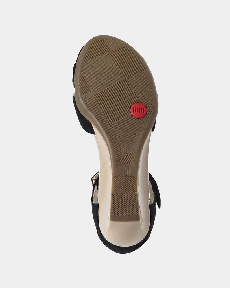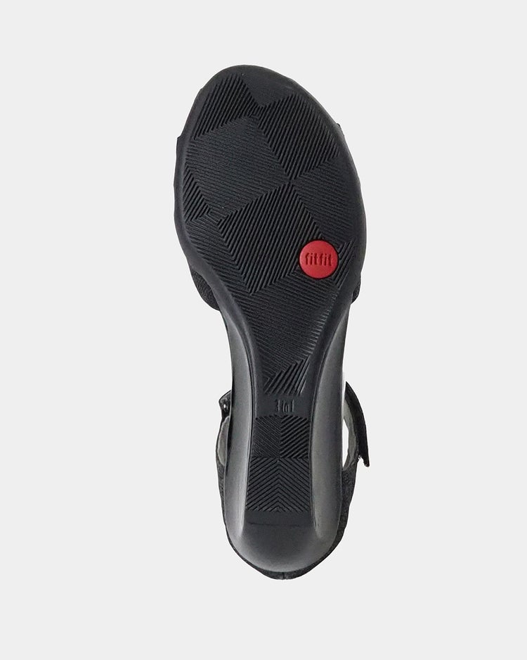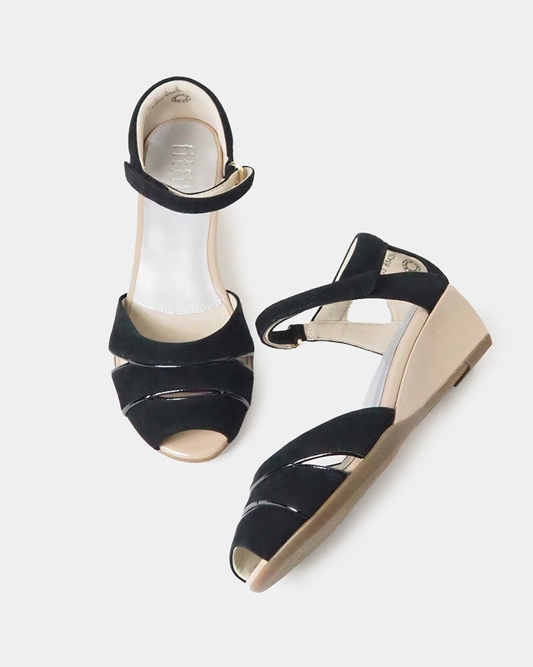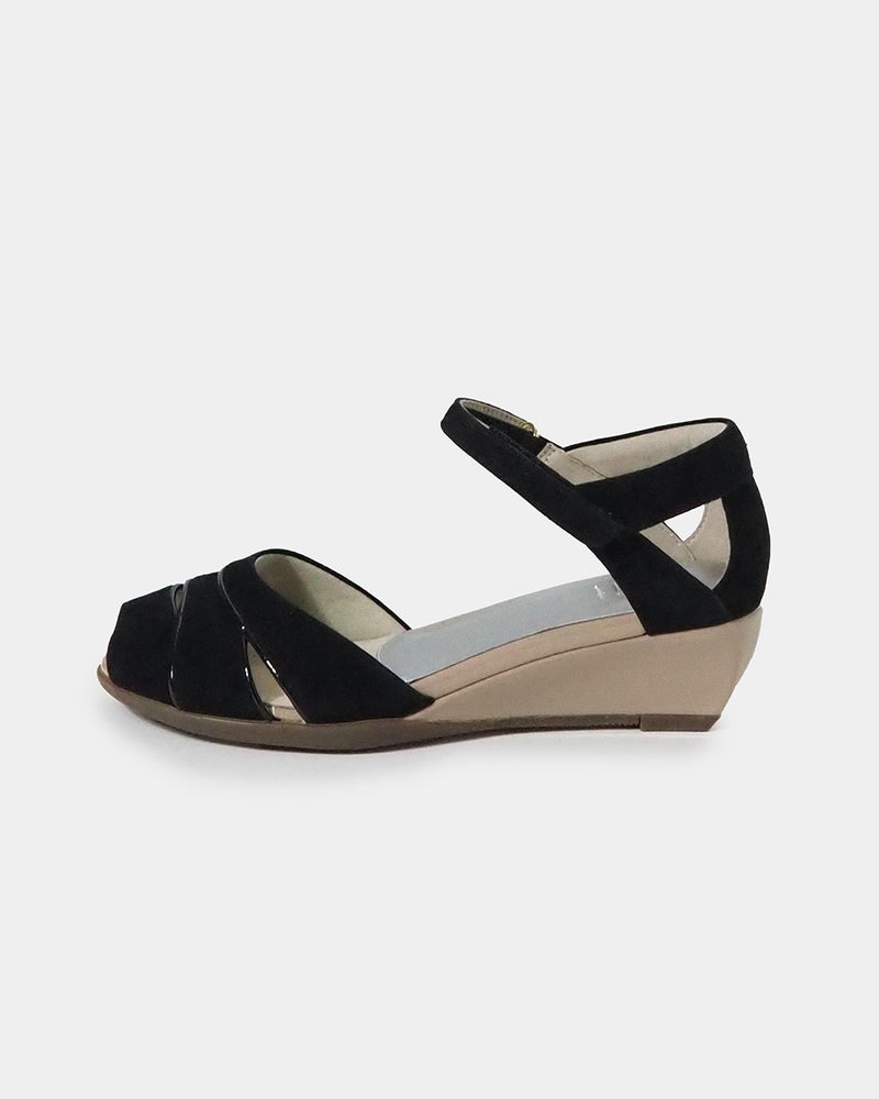 普段のサイズ:24.5cm 着用感:ちょうどよい - 踵と足首ベルトでフィット感があり、前滑りしなかった。細めのウェッジソールでも足裏全体の安定感があり、歩行時のブレが少なかった。