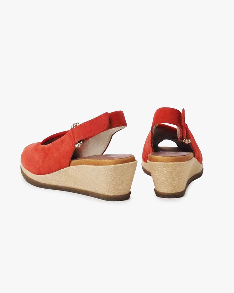 オレンジに近いレッド。心配無くJeansに合わせると、足元のお洒落感がでました。この色、お安く購入もでき嬉しいかったです。