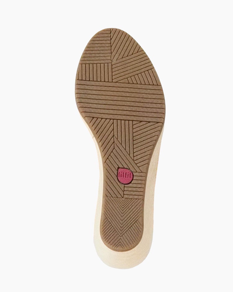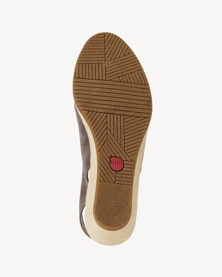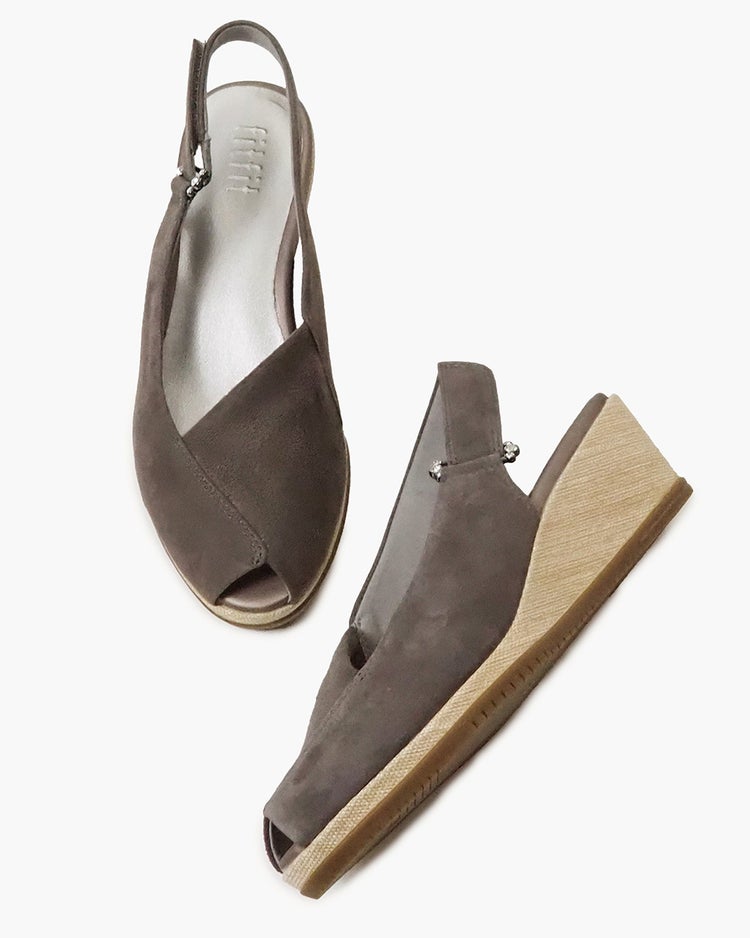 普段のサイズ:22.5㎝ 着用感:ちょうどよい - いつものサイズで最初は少しタイト目かと思いましたが、一日履いていたらすっかり馴染んで、丁度よくなりました。ストレッチ部分のお陰でとても楽に履け、ウェッジソールで安定しているので、長時間履いても疲れにくいです。足が薄いので、つま先があいていると前滑りしやすいのですが、あき具合が丁度よく、甲の部分のカットが気に入っています。少し日焼けして素足に履きたいと思います。