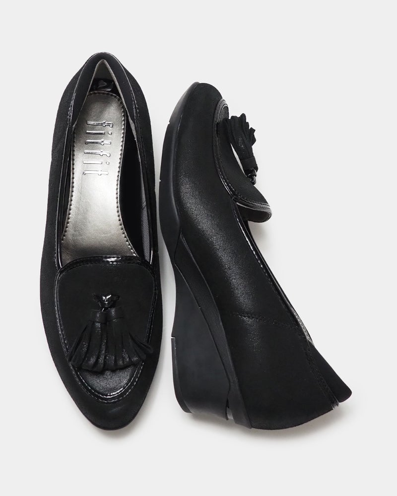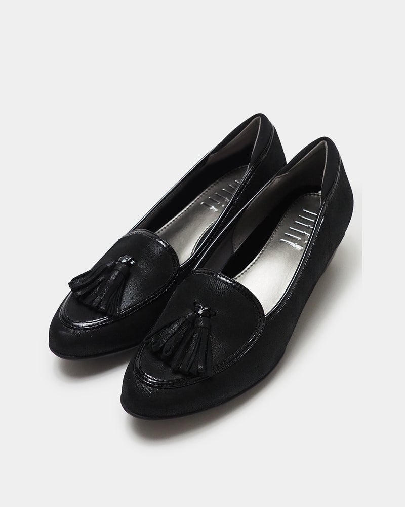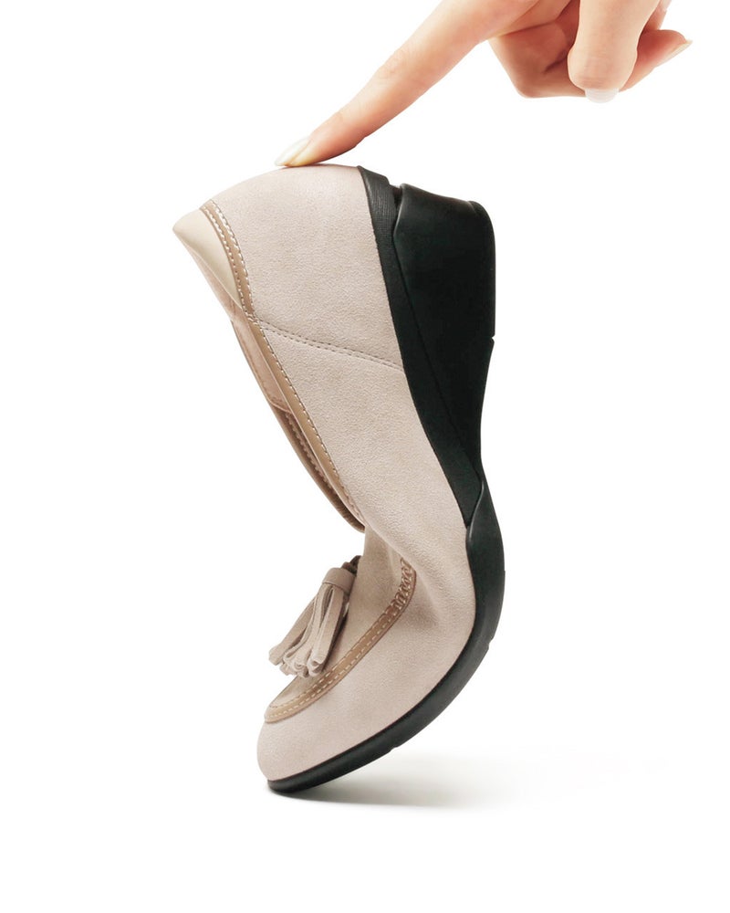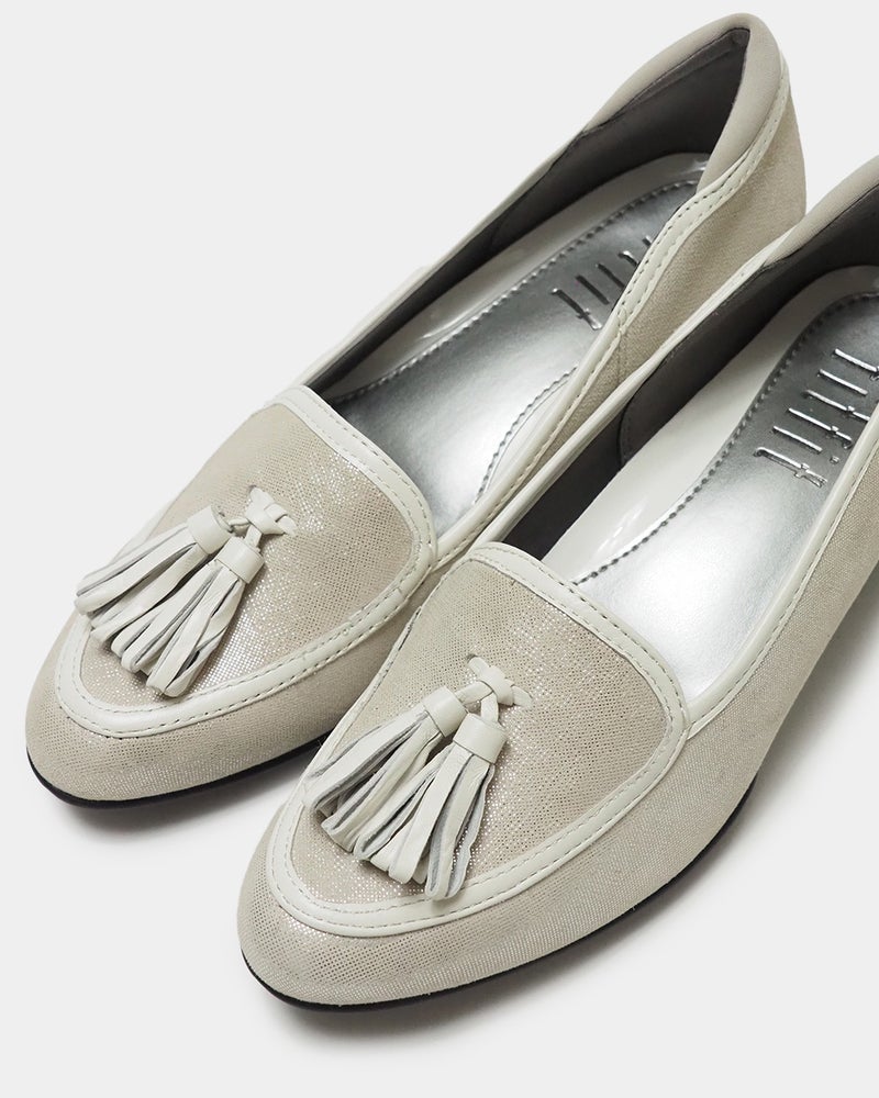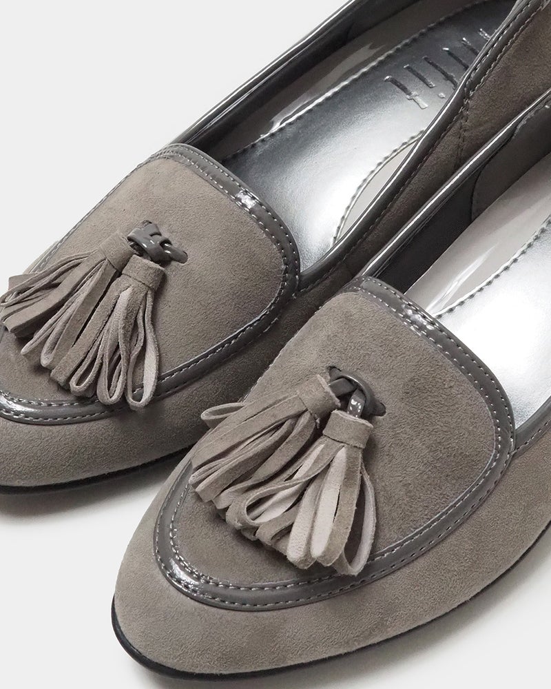 スッキリ見えの5cmヒールにタッセルを添えたクラシカルパンプニーカー