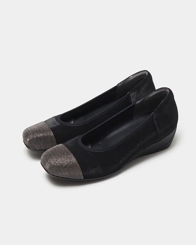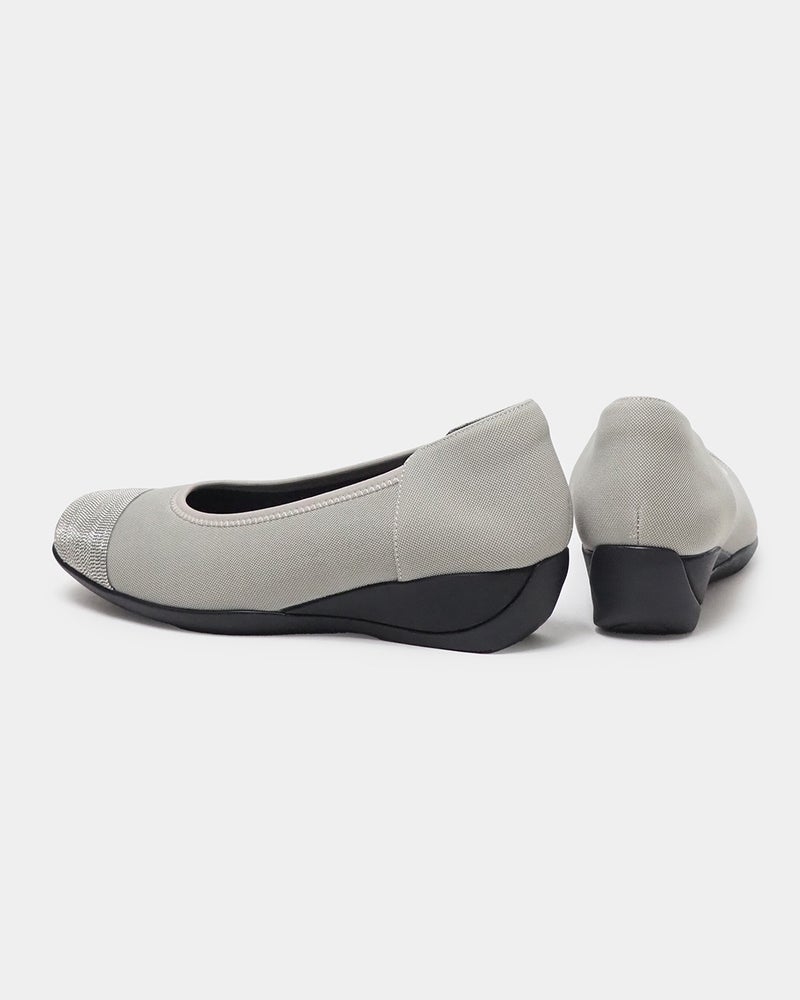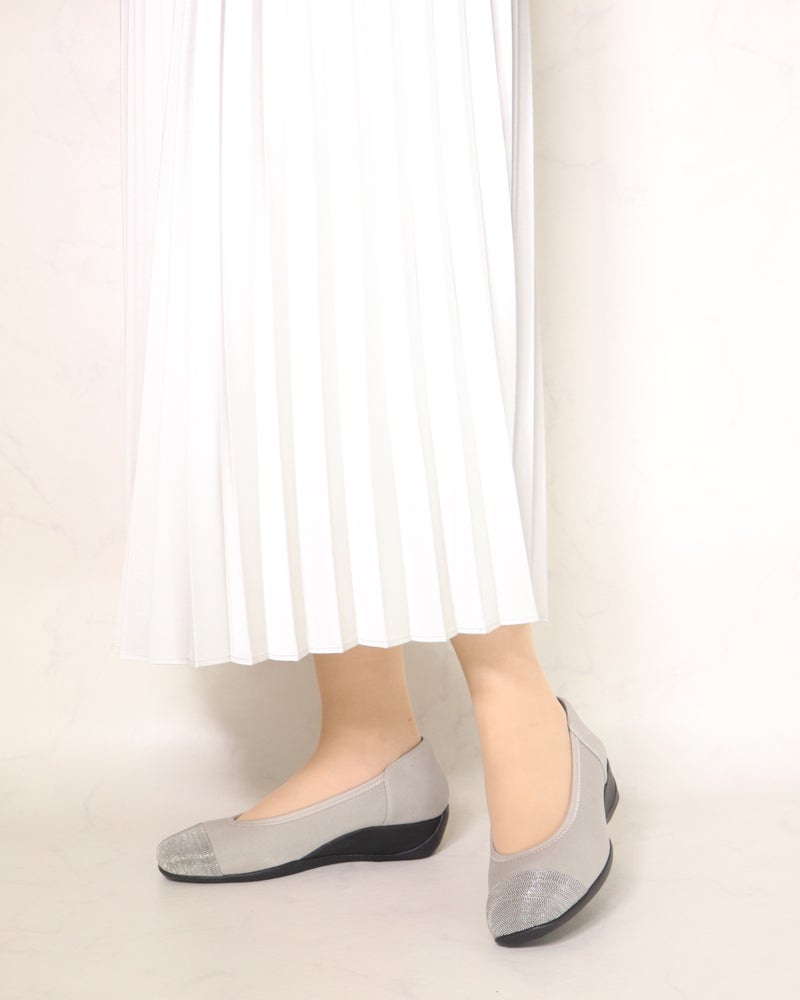 天気が不安定な日にも安心な撥水機能のある晴雨兼用のヒールアップバレエの中でも少し華やかなデザインで、お出かけやオケージョンシーンまで足にストレスを感じることなく履いていただけるアイテムです。