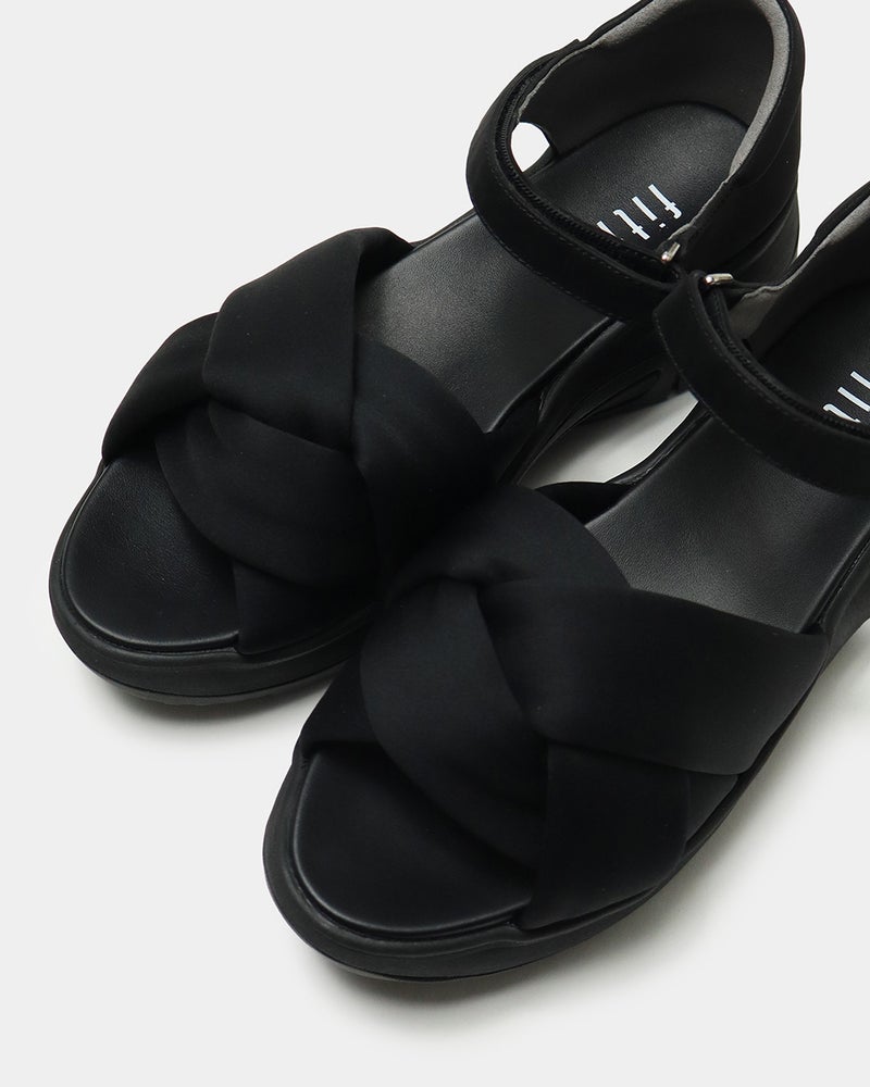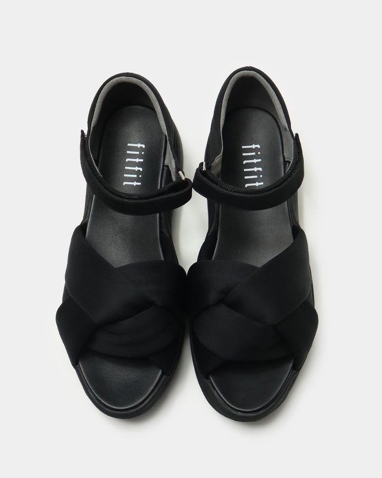 ツイストクッションのアッパーデザインと踵部分を包み込んだ足首ベルトのデザインは、安定感が高く指の形が表に響かない、どんどん歩ける大人の厚底サンダルとなっています。