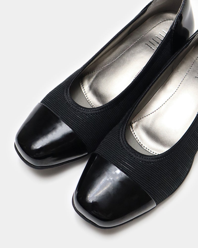解放感のあるスクエアトゥと、さりげない切り替えがポイントのバイカラーデザインで、シンプルながらも洗練された印象を与えます。
