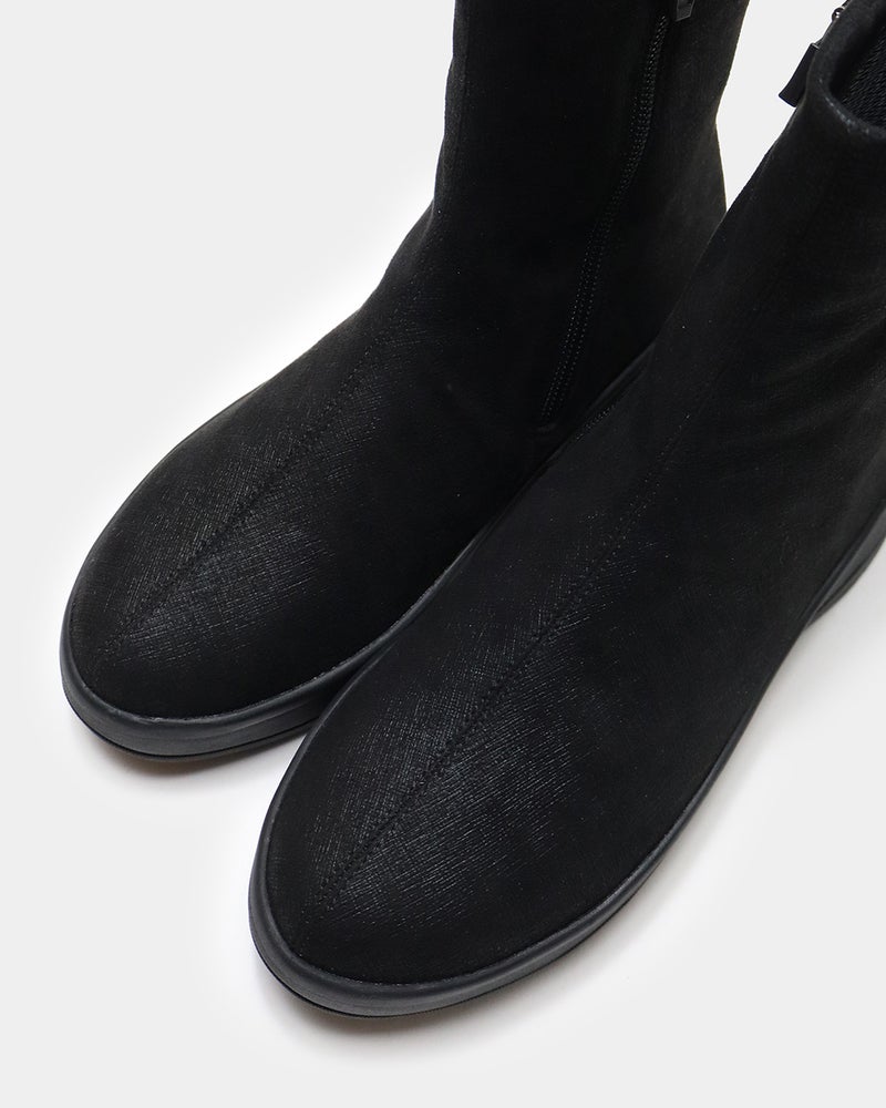 斜めのジッパーが脱ぎ履きをスムーズにし、センターシームの切り替えが縦のラインを強調して美しい足元を引き立てます。