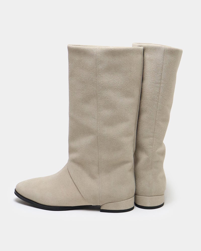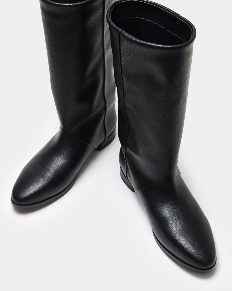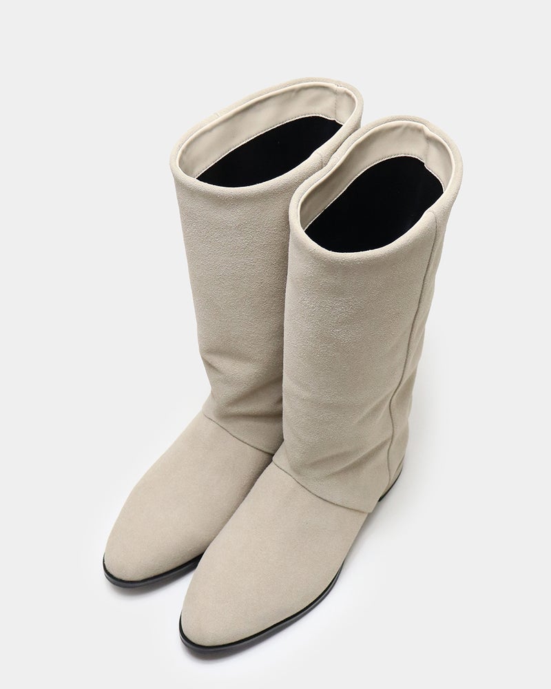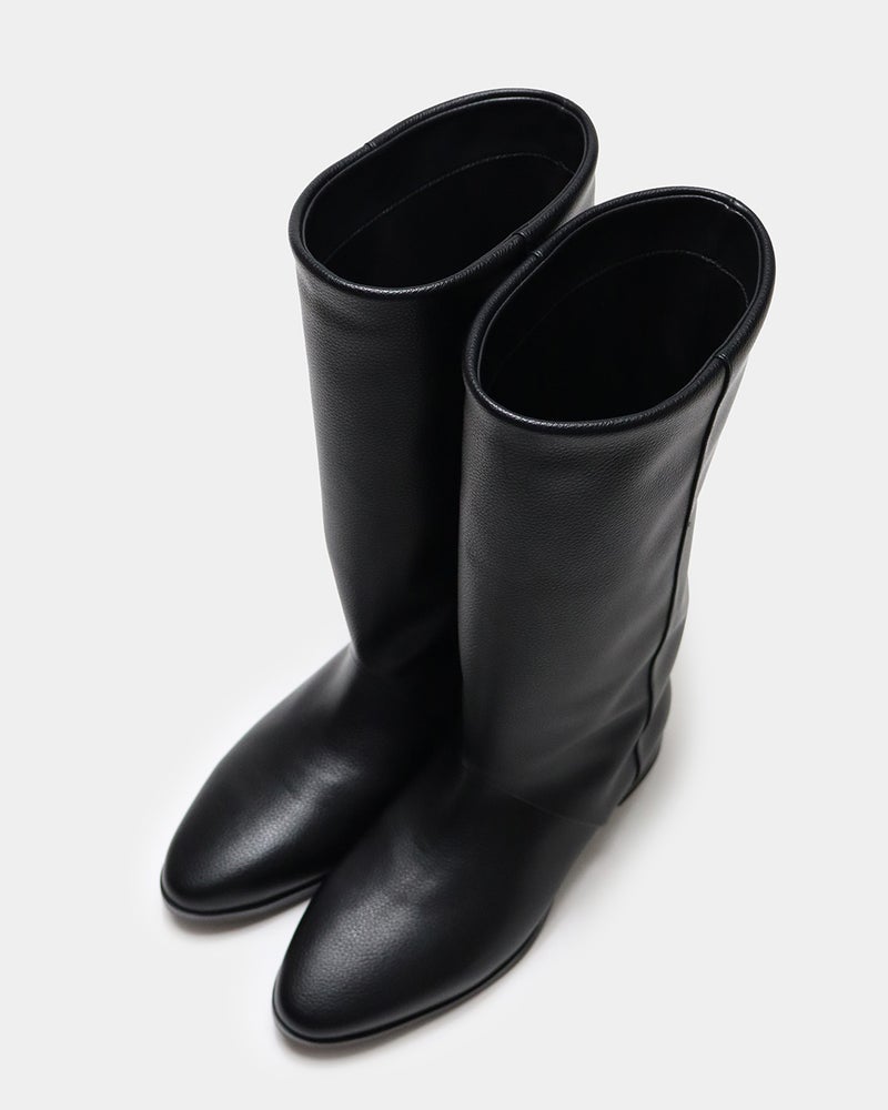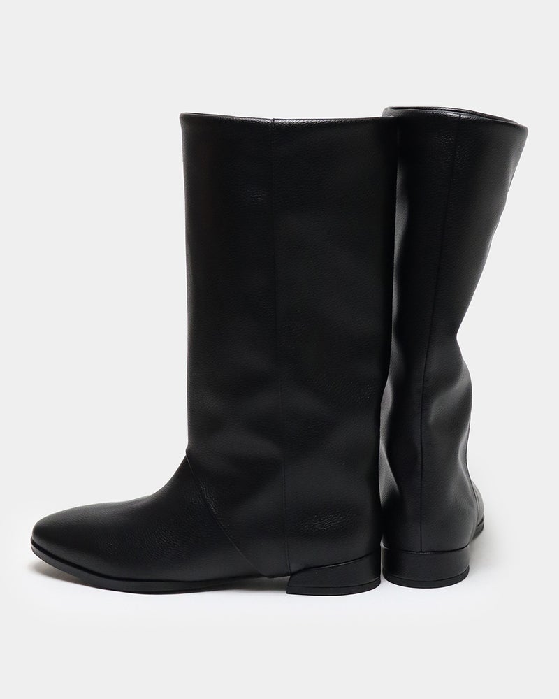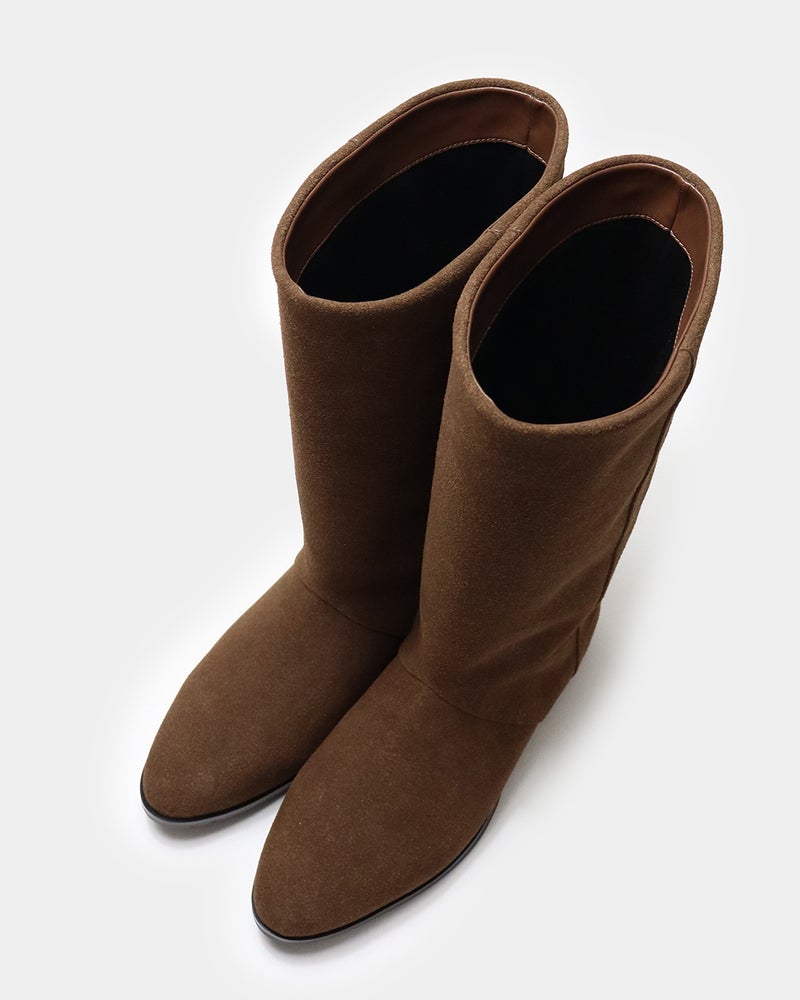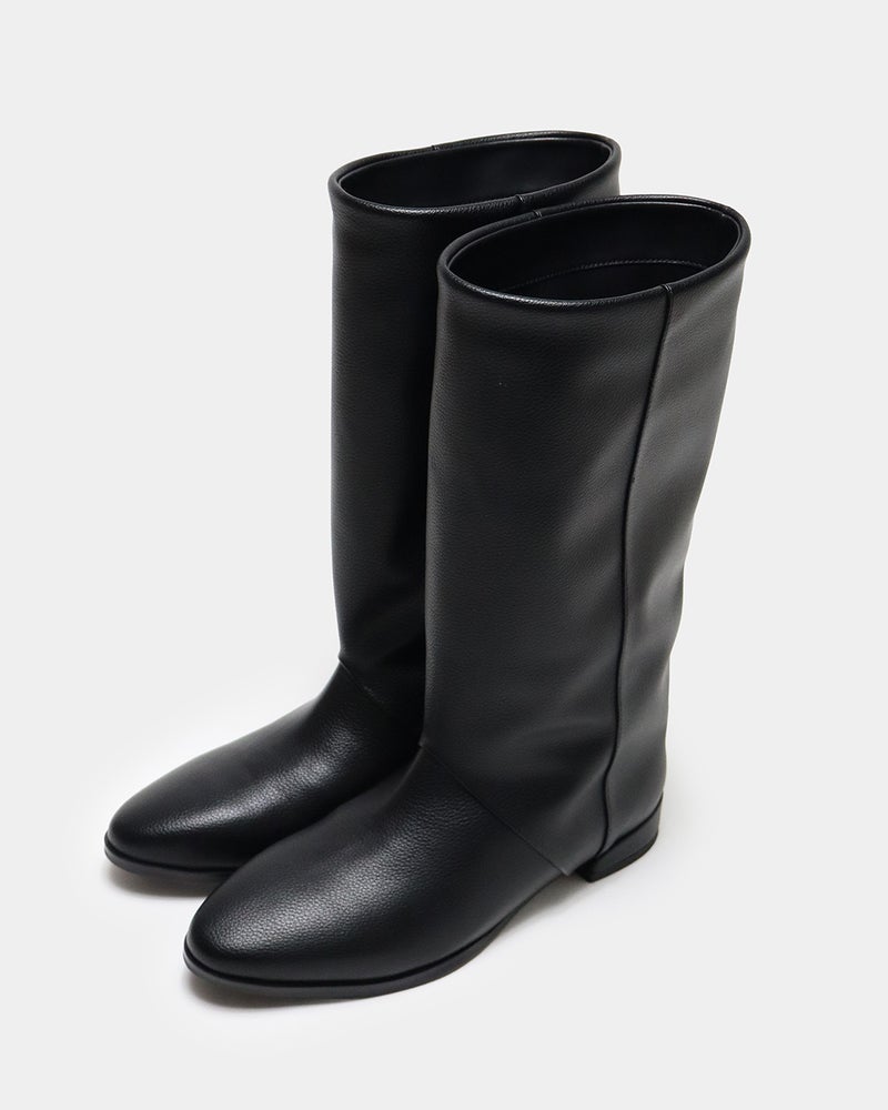 足首にゆとりをもたせたルーズシルエットブーツ。 足元に程よいゆとりをもたせたルーズシルエットが魅力のミドル丈ブーツが新登場。 直線的なフォルムと細身に仕上げた丸みのあるトゥの組み合わせで、脚をすっきりと長く美しく見せてくれるデザインです。 リアルレザーのような上質な素材感に撥水加工を施しており、天候を気にせずデイリーにお使いいただけるのも嬉しいポイント。 ブーツ特有の脱ぎ履きの煩わしさを軽減するノンジッパー仕様で、スムーズに着脱できるのも魅力です。 歩行の安定性にもこだわり、従来のルーズブーツで課題となりがちな踵の浮きを二重構造で解消。 カーブを効かせたデザインでしっかりと踵をホールドし、長時間歩いても疲れにくい快適な履き心地を実現しました。 インソールにはモチモチとした厚みのあるラテックス素材を採用。 衝撃吸収力が高く、アーチ部分をやさしく支える立体設計で足裏に心地よくフィットします。 アウトソールは軽量ラバーを使用し、グリップ性と衝撃吸収性が高く、足取りを軽やかにサポートします。 大人っぽい細身のエッグトゥを採用し、すっきりとした印象で甲高の方にも安心して履いていただける設計に。 ロング丈よりもコーディネートに取り入れやすいミドル丈で、防寒性にすぐれつつも春先までロングシーズン活躍でき、カジュアルにもスタイリッシュにも合わせやすく、幅広いコーディネートにマッチする一足です。 ※完全防水ではございません。 ※濡れた路面では乾いた路面よりも滑りやすくなります。雨天などで濡れた路面を歩く場合は、転倒などの危険がありますので、十分ご注意ください。