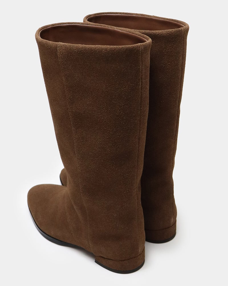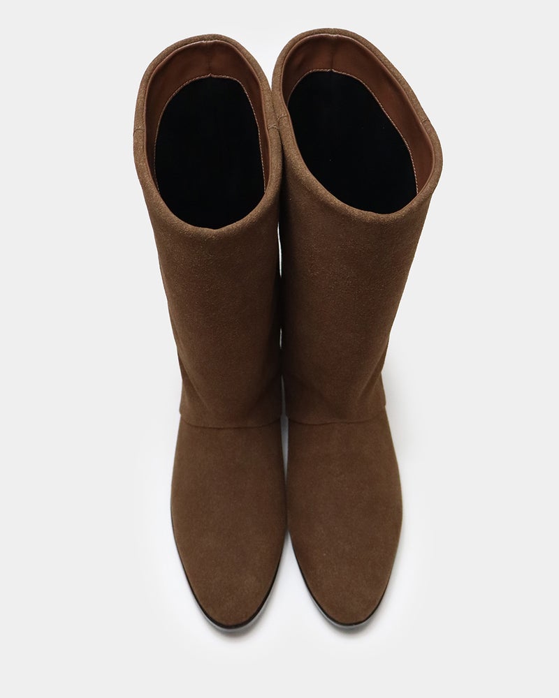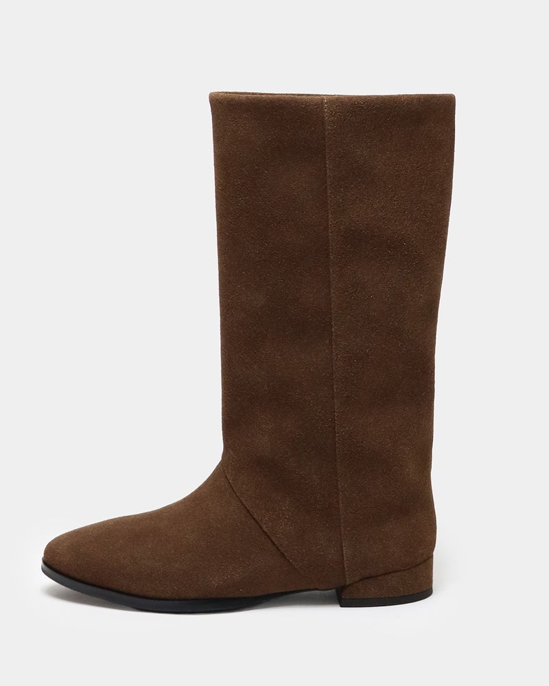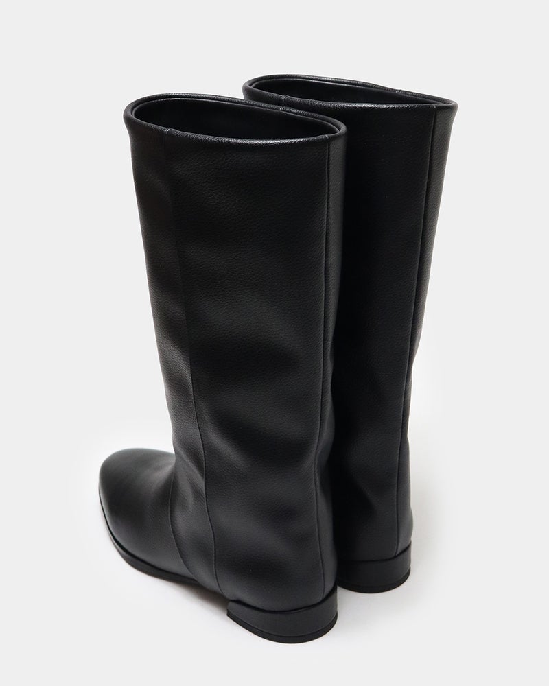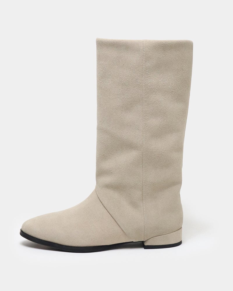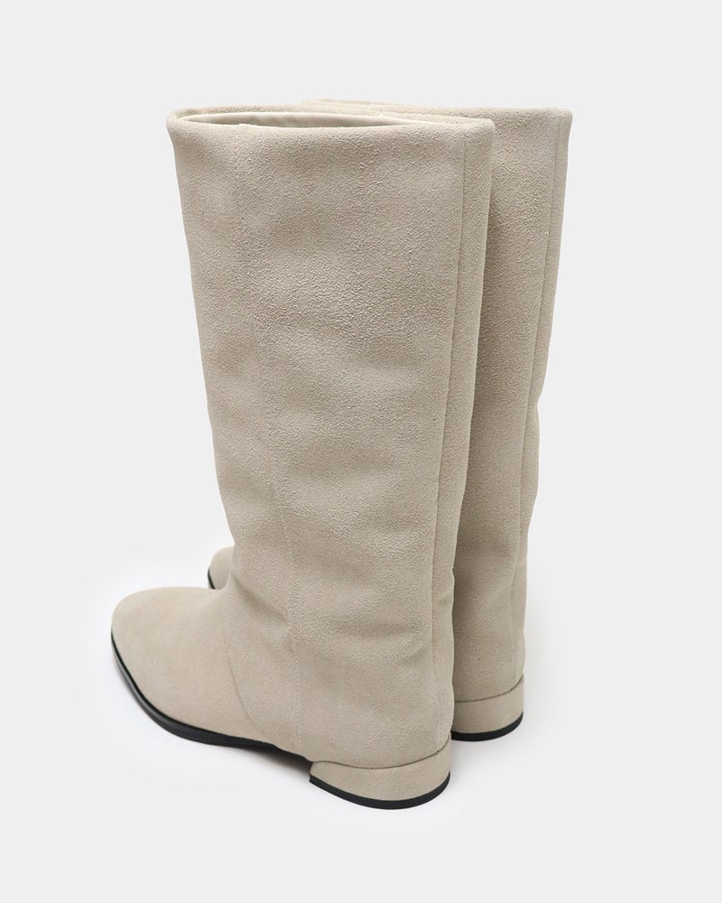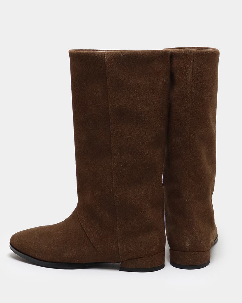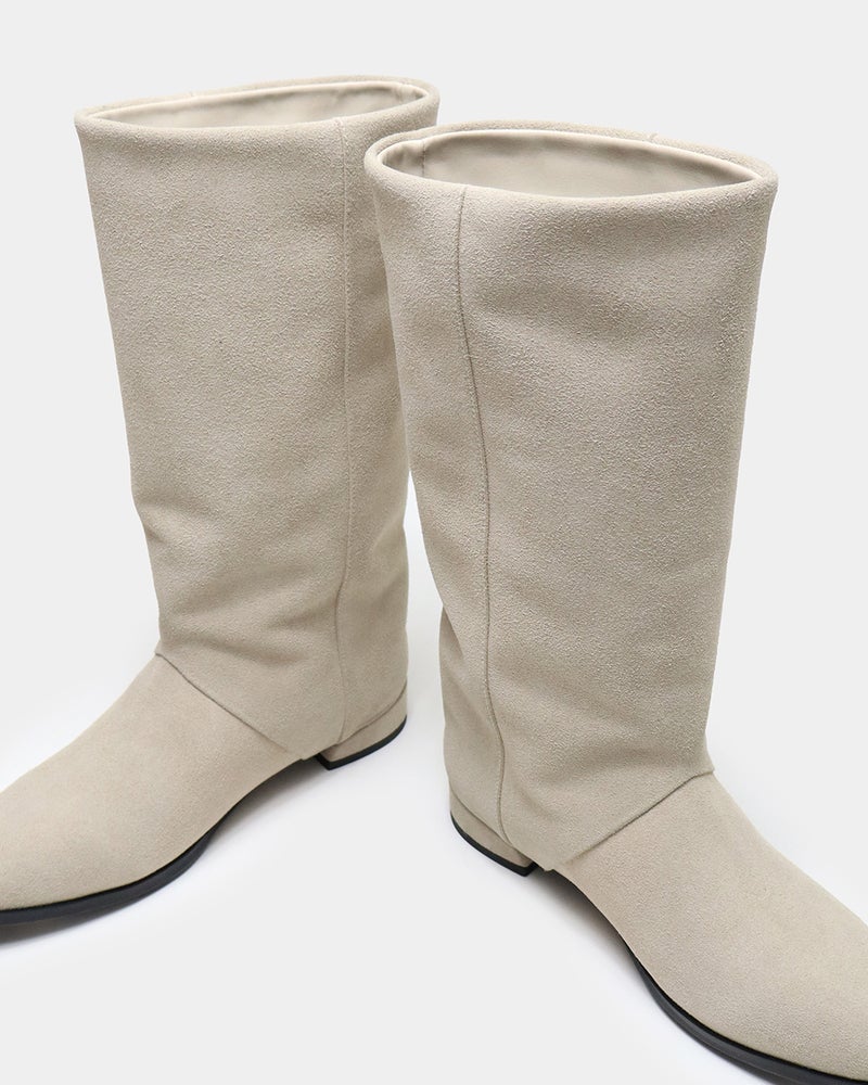 足首にゆとりをもたせたルーズシルエットブーツ。 足元に程よいゆとりをもたせたルーズシルエットが魅力のミドル丈ブーツが新登場。 直線的なフォルムと細身に仕上げた丸みのあるトゥの組み合わせで、脚をすっきりと長く美しく見せてくれるデザインです。 リアルレザーのような上質な素材感に撥水加工を施しており、天候を気にせずデイリーにお使いいただけるのも嬉しいポイント。 ブーツ特有の脱ぎ履きの煩わしさを軽減するノンジッパー仕様で、スムーズに着脱できるのも魅力です。 歩行の安定性にもこだわり、従来のルーズブーツで課題となりがちな踵の浮きを二重構造で解消。 カーブを効かせたデザインでしっかりと踵をホールドし、長時間歩いても疲れにくい快適な履き心地を実現しました。 インソールにはモチモチとした厚みのあるラテックス素材を採用。 衝撃吸収力が高く、アーチ部分をやさしく支える立体設計で足裏に心地よくフィットします。 アウトソールは軽量ラバーを使用し、グリップ性と衝撃吸収性が高く、足取りを軽やかにサポートします。 大人っぽい細身のエッグトゥを採用し、すっきりとした印象で甲高の方にも安心して履いていただける設計に。 ロング丈よりもコーディネートに取り入れやすいミドル丈で、防寒性にすぐれつつも春先までロングシーズン活躍でき、カジュアルにもスタイリッシュにも合わせやすく、幅広いコーディネートにマッチする一足です。 ※完全防水ではございません。 ※濡れた路面では乾いた路面よりも滑りやすくなります。雨天などで濡れた路面を歩く場合は、転倒などの危険がありますので、十分ご注意ください。