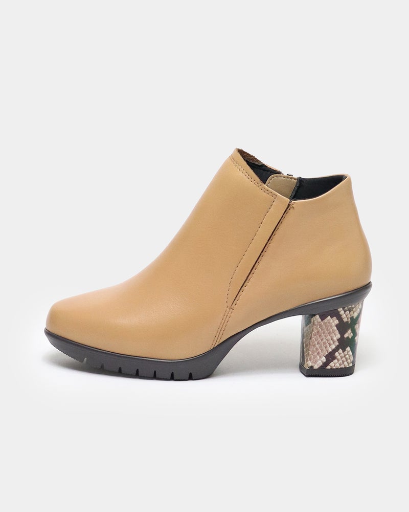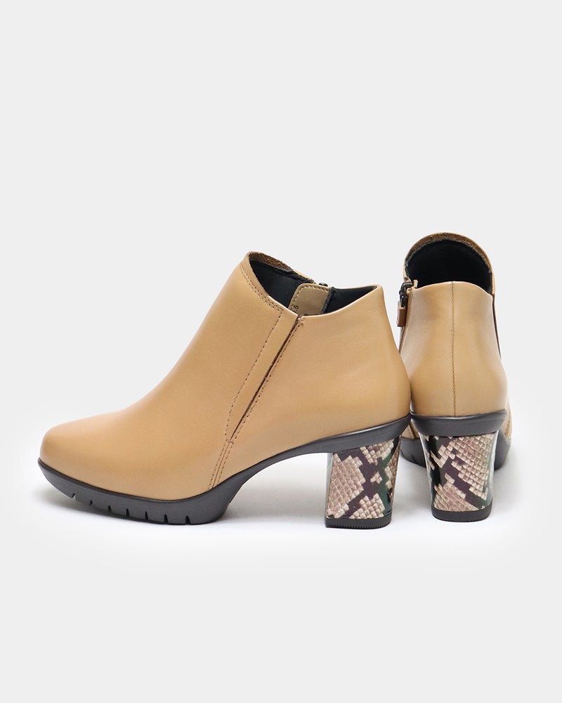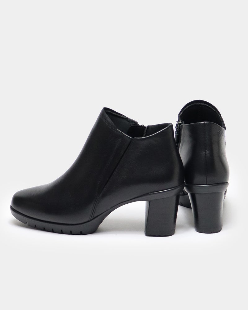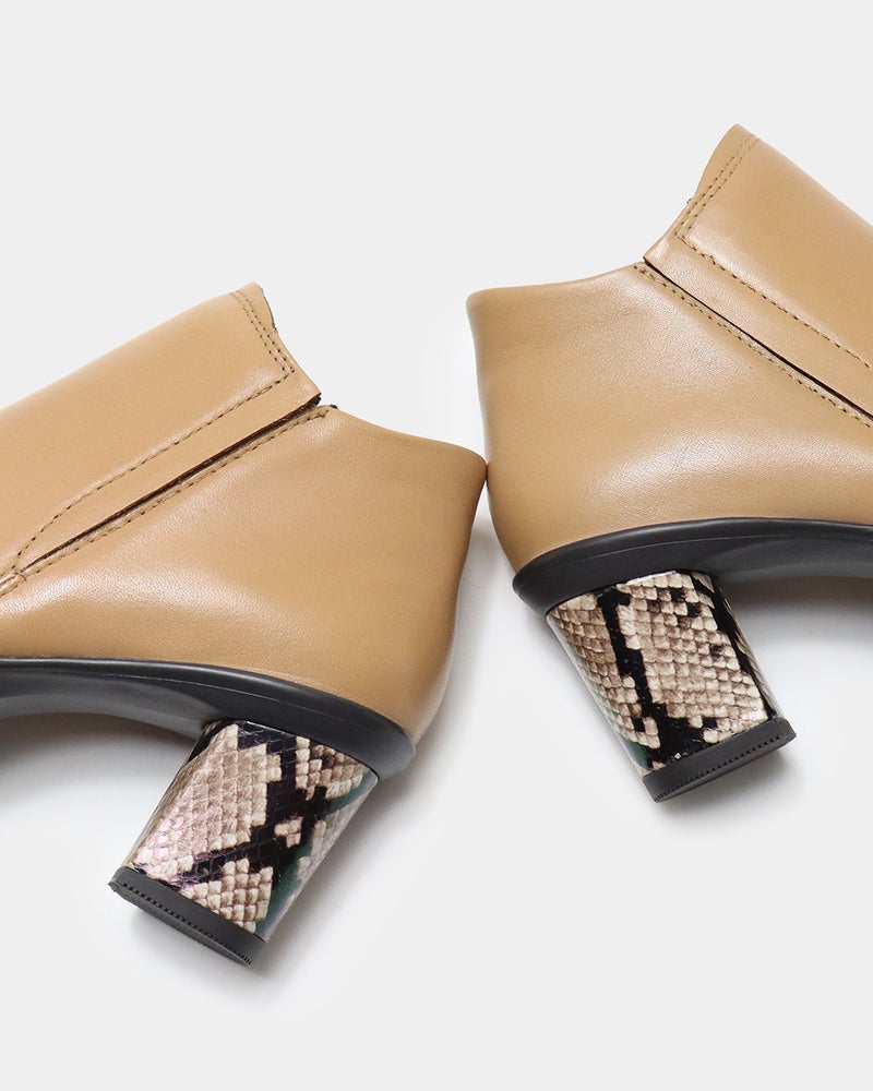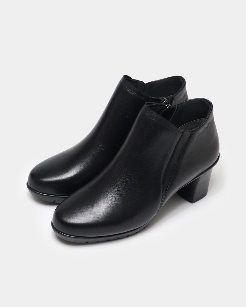 足首スッキリの美脚ヒールブーツ。 7cmヒールでありながら安定感のある大人の女性にふさわしいショートブーツが登場です。 ショート丈でパンツにもスカートにも合わせやすく、足首をすっきり見せることで美脚効果を発揮。 高めのヒールでも快適に歩けるソール設計を採用しているため、長時間の外出や移動にも対応できます。 レザー調素材と丁寧なカッティングが上品さとモード感を兼ね備え、きれいめにもカジュアルにも使える万能さが魅力です。 木型は7cmヒールの高さを感じさせない設計で、踵にしっかりと重心が乗るよう工夫されており、前滑りを防ぎながら安定した履き心地を実現。 アウトソールはトレンドのタンクソール調デザインを大人仕様にスマートにアレンジし、EVAソールを採用することで軽さと屈曲性の良さを両立しました。 インソールは足を入れた瞬間ふんわりとしたクッション性を感じられるカップインソールで、足裏への衝撃をやさしく吸収。 抗菌防臭加工を施したメッシュ素材を表面に用いて、長時間履いても快適に着用することができます。 アッパーはシンプルでありながら洗練されたくるぶし丈のデザインで、外側に隠しゴムを配し、内側のジッパーで着脱がスムーズにできる仕様です。 足首を細く見せる曲線的な履き口ラインや、筒の前部分が足に当たりにくい切りっぱなしの仕上げにより、快適さと美しさを両立。 本革ならではの質感がスタイリングを格上げし、様々なデザインのボトムスとも相性がよく、フォーマルな場面から日常のコーディネートまで幅広く活躍する一足です。