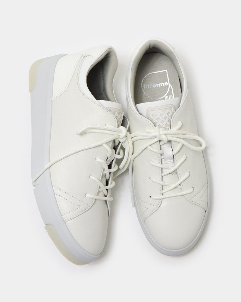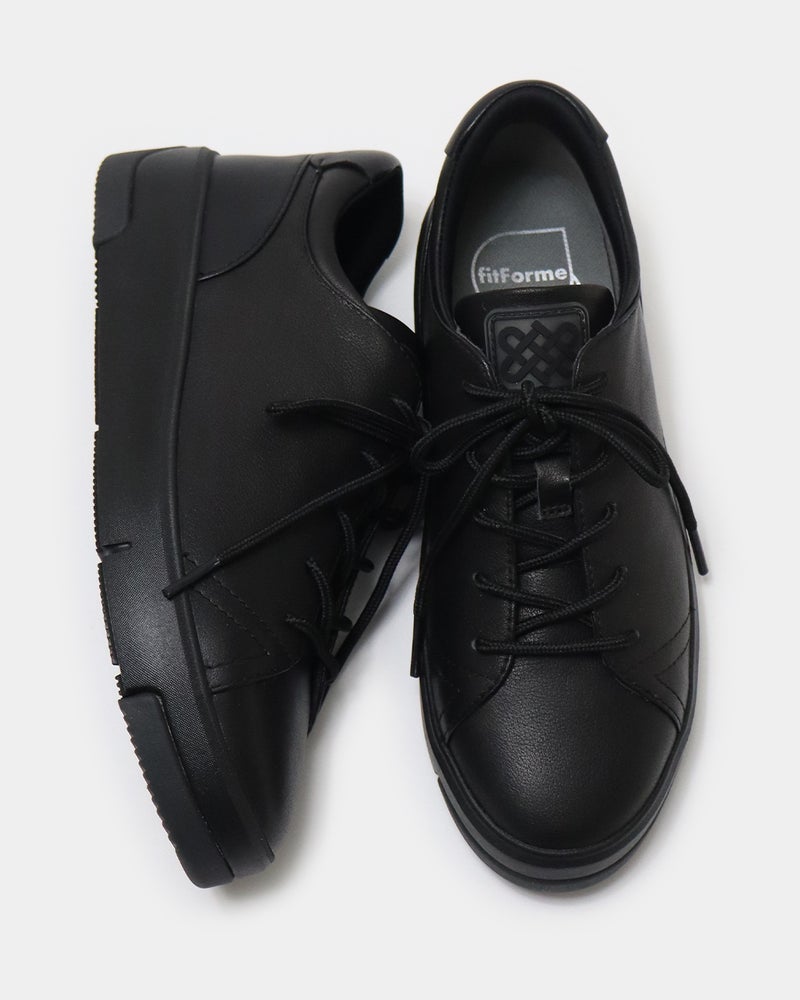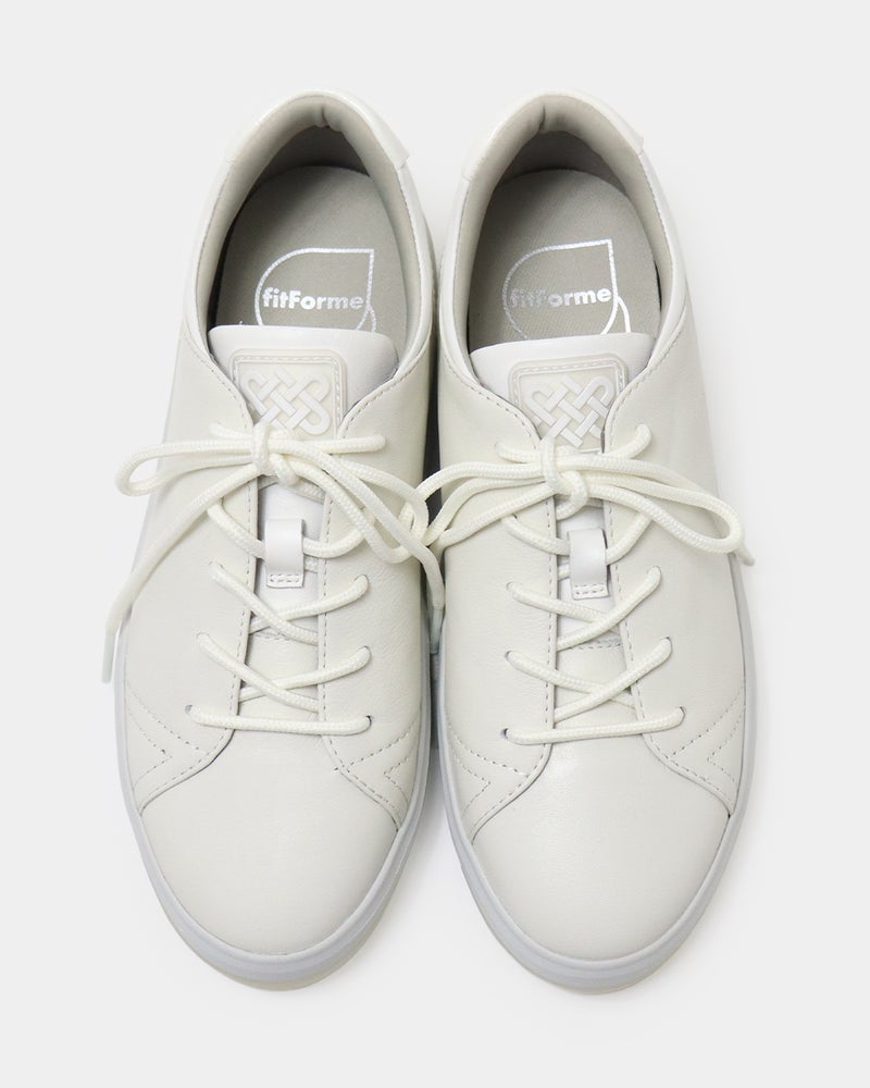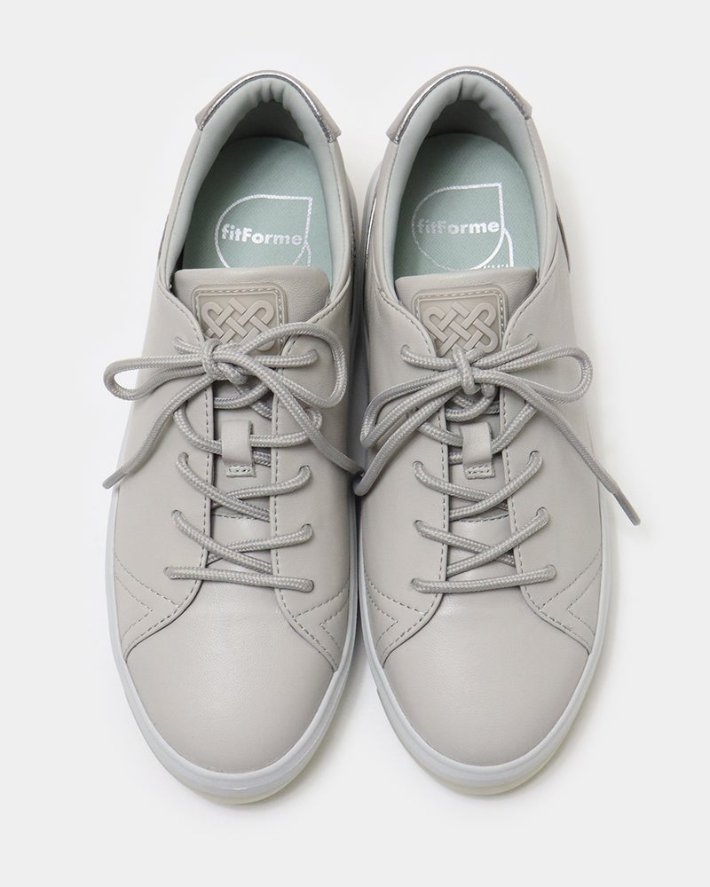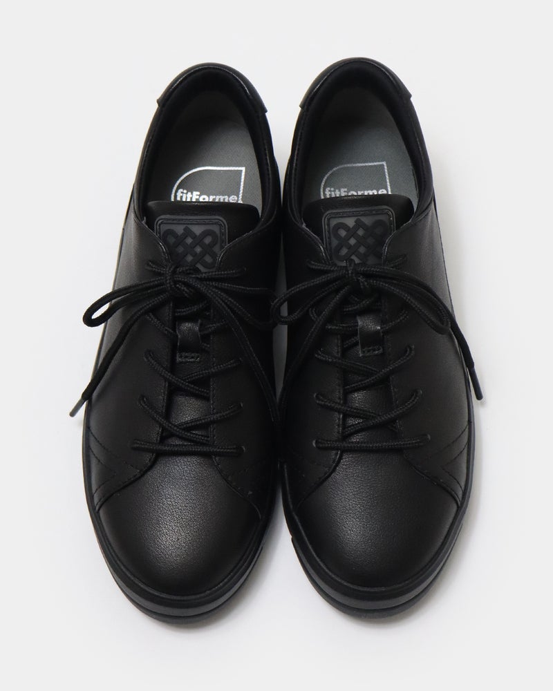 「きれい」を届ける大人のためのシンプルレザースニーカー。 柔らかな本革を採用し、上品なラウンドトゥのハイライズレザーラストにより足入れが快適で、2㎝のインヒールが足長効果をもたらし、ソックスでも履けるゆとりのあるサイズ感です。 アウトソールは軽量で弾力性のあるEVAを主とし、つま先と踵には軽量ラバーパーツを配した新ハイブリッドソールを採用。 耐久性と防滑性を高めつつ、素材感の違いがデザインのアクセントとなり、サイドの見え方もスッキリとスタイリッシュに仕上げています。 インソールはfitfitオリジナルのフィットフォルムインソールを搭載し、国際医療福祉大学三田病院と共同開発した独自設計で土踏まずの縦アーチと指の付け根の横アーチを3つのポイントから支え、足裏全体をやさしくサポートすることで長時間の歩行も快適です。 アッパーはシンプルながら上質な本革を使用し、シュータンや踵のクッションで安定感のある履き心地を実現。 モダンなエンブレムが普遍的なレースアップスニーカーをグレードアップし、スポーティになりすぎず、どんなコーディネートにも自然に馴染むデザインです。 シンプルなスタイルをワンランク上に見せ、大人のシンプルコーデやきれいめカジュアル、通勤スタイルにも合わせやすく、トレンドのスポーツミックスコーデとも好相性。 上品さと快適性を兼ね備えた、日常のさまざまなシーンで活躍する一足です。