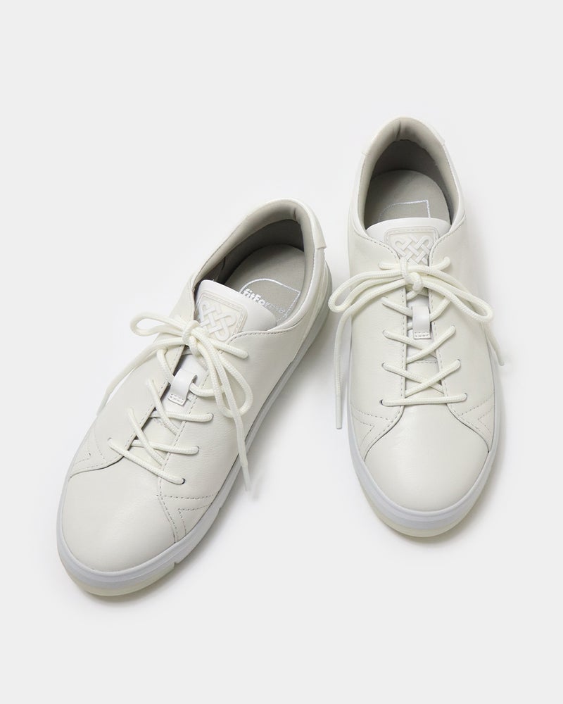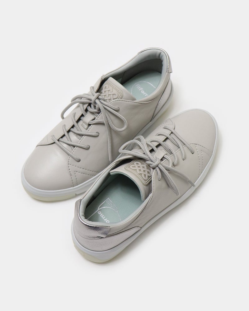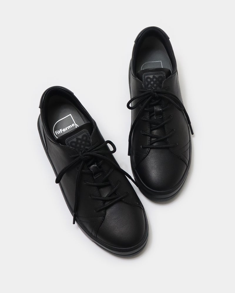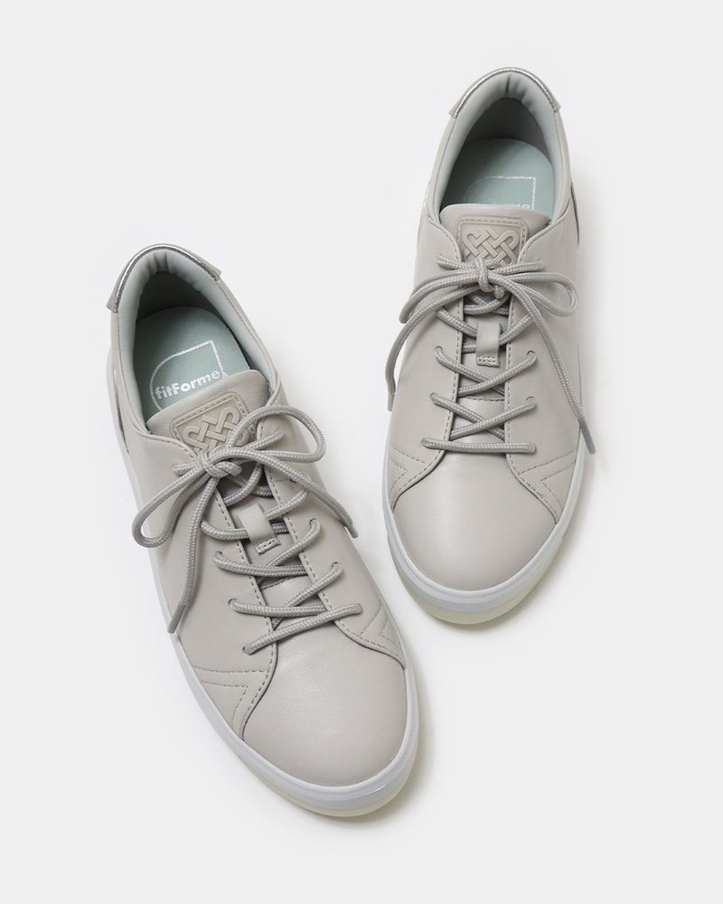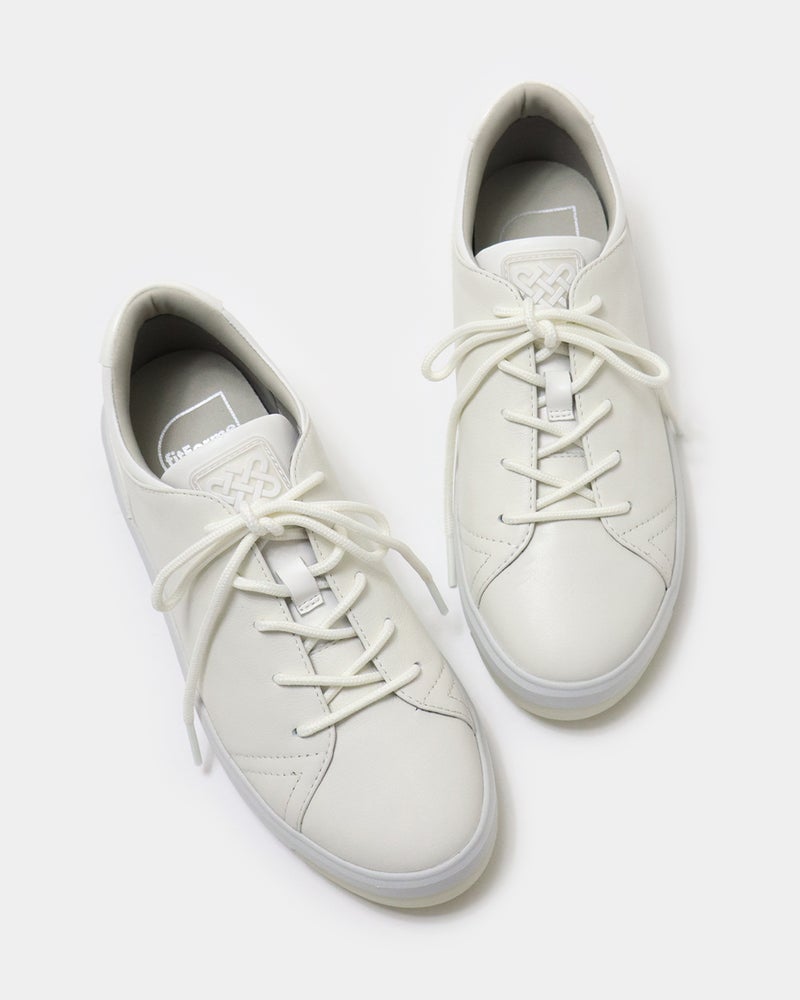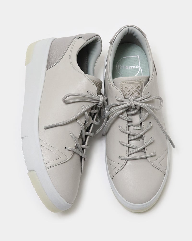 「きれい」を届ける大人のためのシンプルレザースニーカー。 柔らかな本革を採用し、上品なラウンドトゥのハイライズレザーラストにより足入れが快適で、2㎝のインヒールが足長効果をもたらし、ソックスでも履けるゆとりのあるサイズ感です。 アウトソールは軽量で弾力性のあるEVAを主とし、つま先と踵には軽量ラバーパーツを配した新ハイブリッドソールを採用。 耐久性と防滑性を高めつつ、素材感の違いがデザインのアクセントとなり、サイドの見え方もスッキリとスタイリッシュに仕上げています。 インソールはfitfitオリジナルのフィットフォルムインソールを搭載し、国際医療福祉大学三田病院と共同開発した独自設計で土踏まずの縦アーチと指の付け根の横アーチを3つのポイントから支え、足裏全体をやさしくサポートすることで長時間の歩行も快適です。 アッパーはシンプルながら上質な本革を使用し、シュータンや踵のクッションで安定感のある履き心地を実現。 モダンなエンブレムが普遍的なレースアップスニーカーをグレードアップし、スポーティになりすぎず、どんなコーディネートにも自然に馴染むデザインです。 シンプルなスタイルをワンランク上に見せ、大人のシンプルコーデやきれいめカジュアル、通勤スタイルにも合わせやすく、トレンドのスポーツミックスコーデとも好相性。 上品さと快適性を兼ね備えた、日常のさまざまなシーンで活躍する一足です。