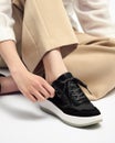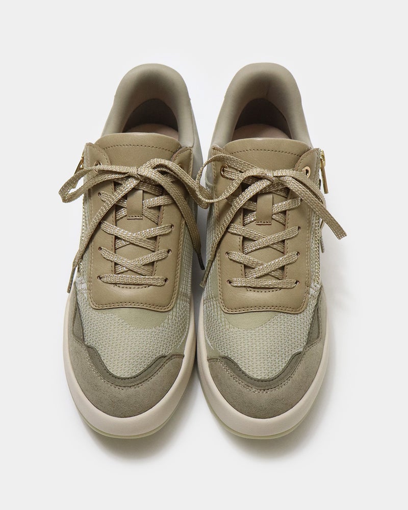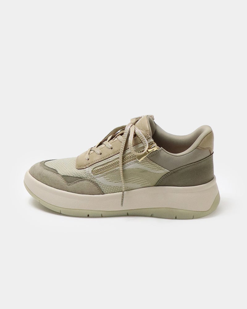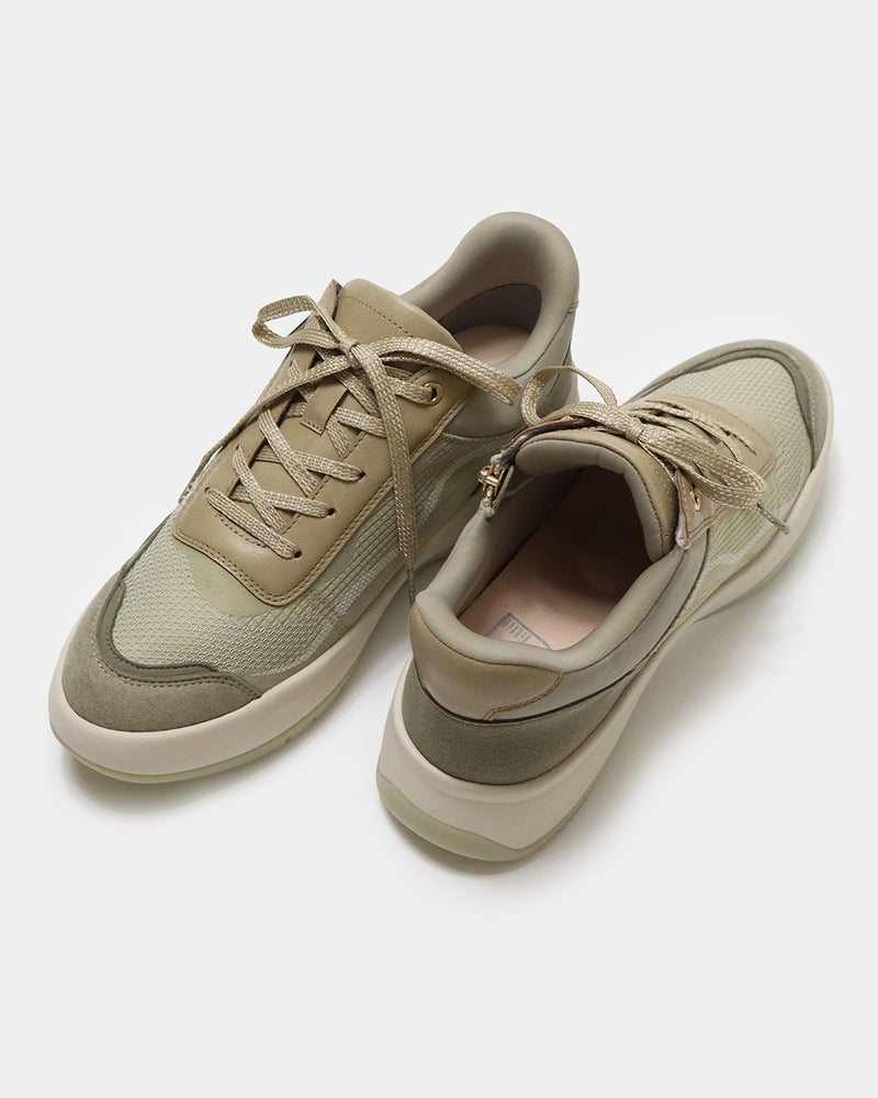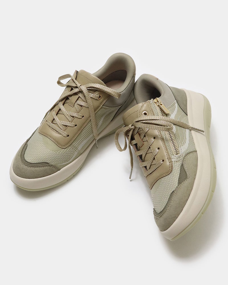 軽さと安定感を両立した、細見えスニーカー。 印象的なサイドジップをデザインアクセントに、紐を解かずにさっと履けるスマートさを備えた大人のためのスニーカー。 メッシュ、起毛、スムースと異素材を掛け合わせ、スポーティになりすぎない上質感とさりげないリッチさを演出しました。 つま先がほっそり見えるfitfitらしいエッグトゥの木型は、見た目はスマートながら指まわりにゆとりを持たせた、窮屈感の少ない履き心地を実現。 約1cmのインヒール入りで自然な脚長効果も期待できます。 アウトソールは高さを抑えつつ、ラバー配合を高めることで濡れた路面でも滑りにくく、安定感のある歩行をサポート。 洗練された設計により軽量化と屈曲性も向上しています。 インソールには三田病院と共同開発したfitformeを搭載し、縦横のアーチを立体的に支えて快適な歩行をキープ。 抗菌防臭メッシュで靴内環境も清潔に保ちます。 撥水仕様のアッパーや伸縮しない平紐でしっかりと足を固定しながら、メタルジッパーやラメ入りシューレースが日常の装いに程よい華やぎをプラス。 安定感とスタイルアップを両立し、きれいめにもカジュアルにも活躍する一足です。 ※完全防水ではございません。 ※濡れた路面では乾いた路面よりも滑りやすくなります。雨天などで濡れた路面を歩く場合は、転倒などの危険がありますので、十分ご注意ください。