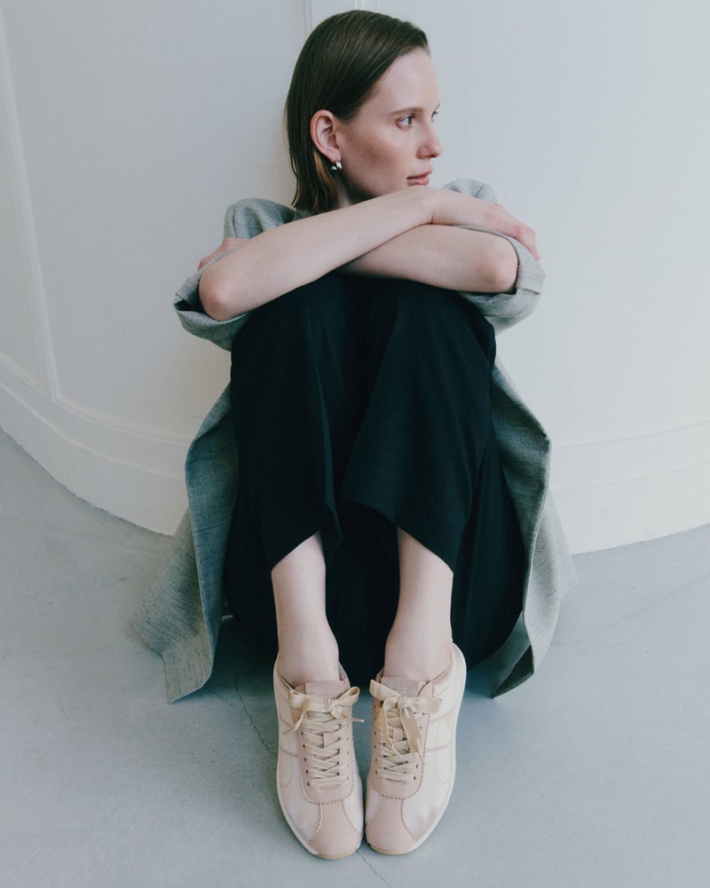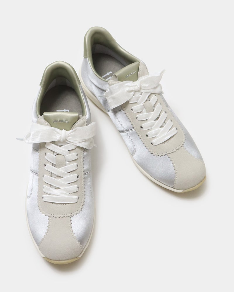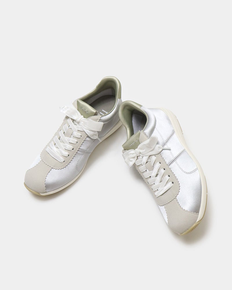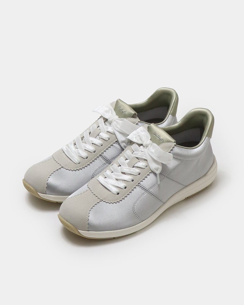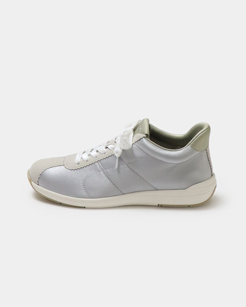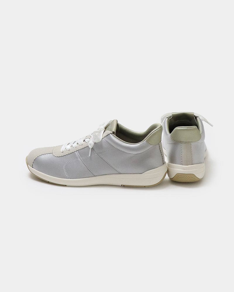 見た目すっきり、履き心地ゆったり、もっちり。 細身シルエットと薄底設計がつくる、美しく洗練された佇まいが魅力のスニーカーに新デザインが登場。 スニーカーでありながら上品な雰囲気を備え、オン・オフ問わず幅広いシーンに馴染む一足。 見た目以上の軽さと柔らかさで、足を包み込むようなやさしい履き心地を実現しました。 新デザインは、サテン素材にステッチを効かせたエレガントでフェミニンなデザインへアップデート。 シューレースは伸縮性と光沢感のある幅広リボンタイプを採用し、結び直し不要で着脱もスムーズなため、“オトナのかわいさ”をさりげなく演出します。 木型はすっきり見える設計ながらも、つま先はややラウンド型でゆとりを持たせ、やわらかなアッパーと相まってリラックス感のある履き心地に。 アウトソールはトレンドの薄底クラシックタイプで、EVAのクッション性をしっかり感じられる厚みを確保しつつ、柔らかなラバーで屈曲性と安定感を両立しています。 インソールはアウトソールが薄めな分、やや厚みを持たせたカップインソールを採用し、踵から土踏まずを包み込むようにサポート。 インヒール仕様で自然なスタイルアップ効果も叶え、蹴り出しやすさにも配慮しています。 アッパーはサテン調素材とスエードのコンビネーションで、すっきりしたシルエットをより柔らかく上品に演出。 ストレッチファブリックのボディは裏張りで伸縮具合を調整し、指の形が表に響きにくく、履き始めから足になじむ設計です。 トレンドの薄底スニーカーにfitfitならではのクッション性を掛け合わせ、旅行やたくさん歩く日にも頼れる快適さと美しさを兼ね備えた一足です。
