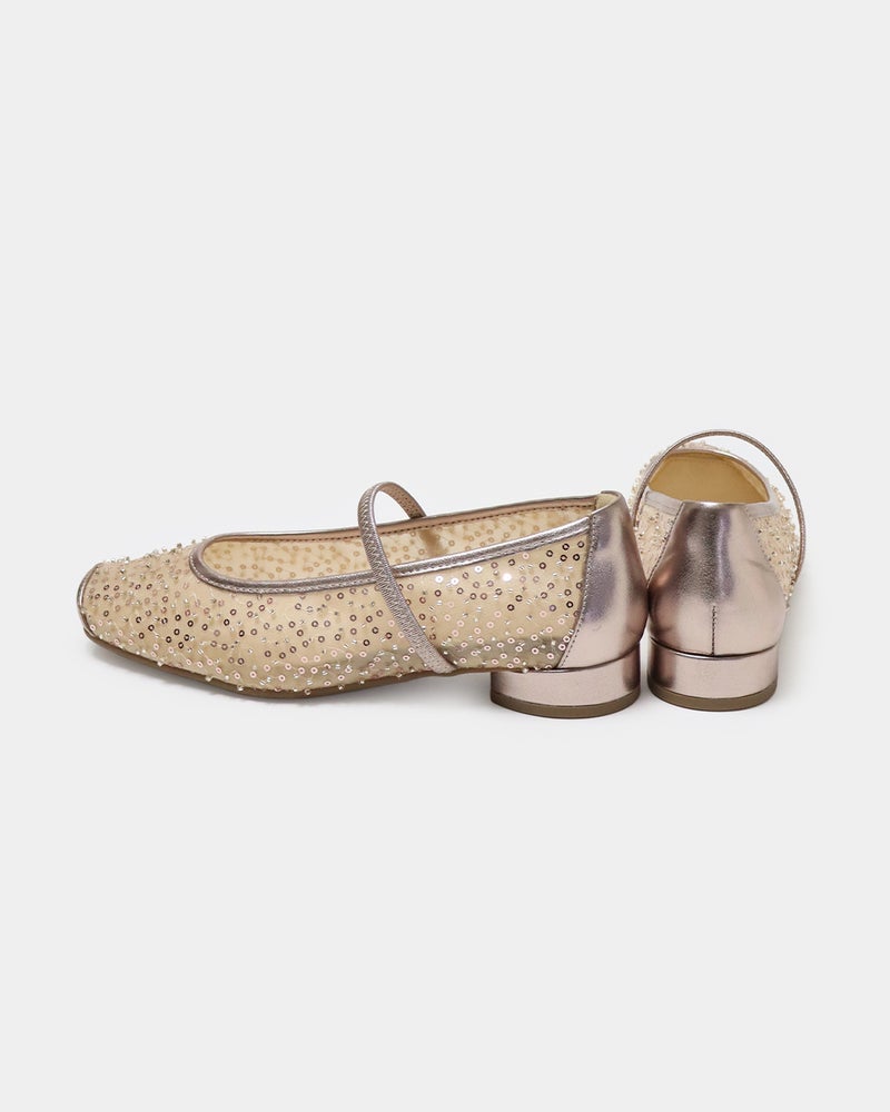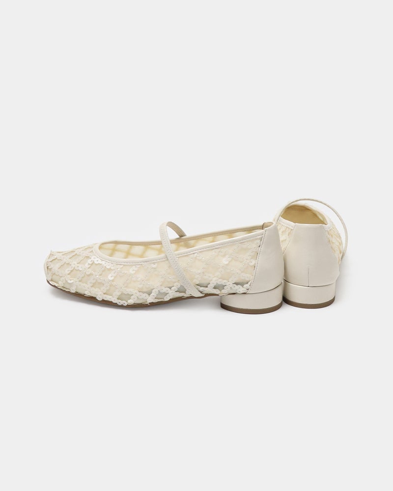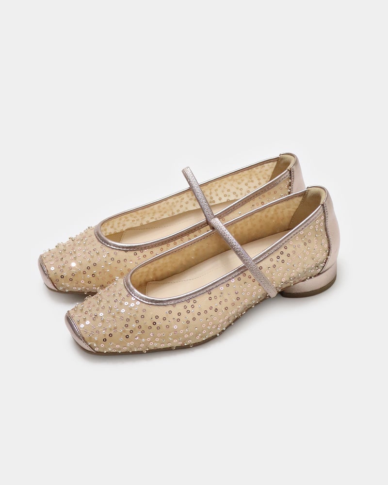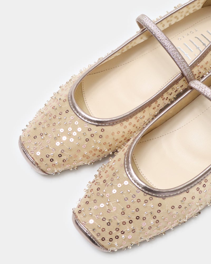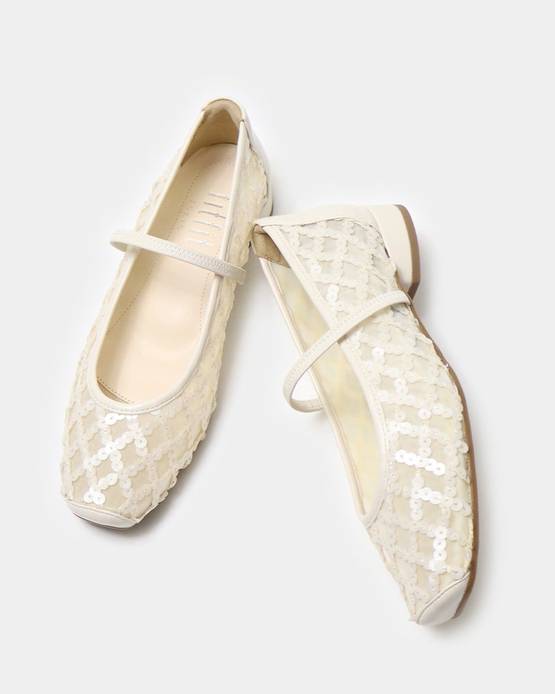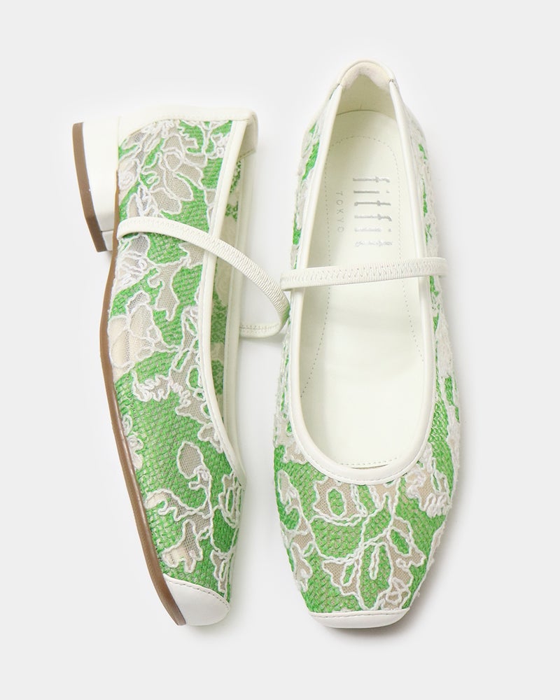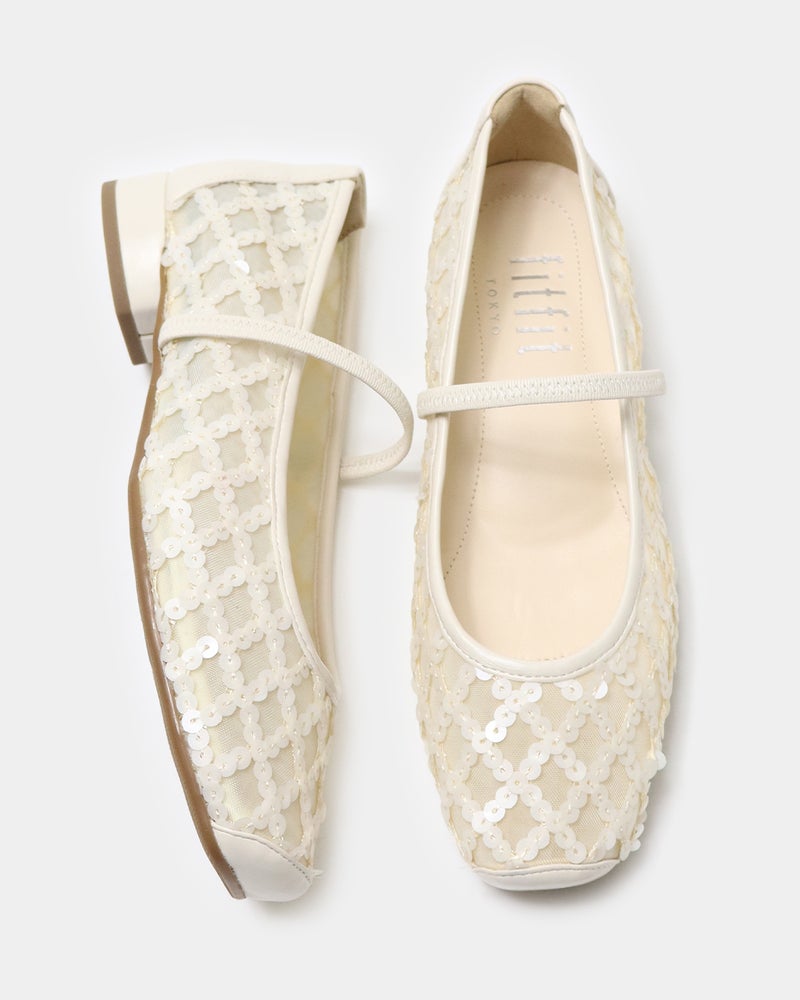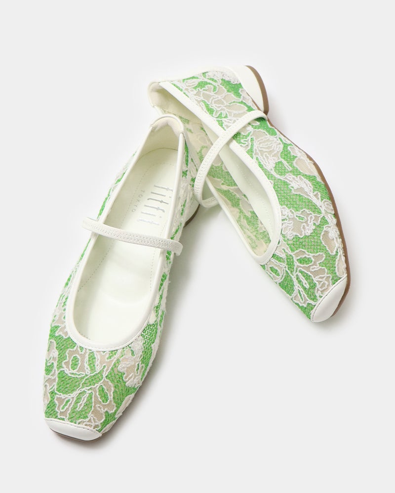 「履くだけで映える」万能フラットシューズが登場。 華やかさと汎用性を兼ね備えた「履くだけで映える」万能フラットシューズ。 ヒールに頼らずとも「きちんと感」と華やかさを両立できるよう設計されており、デイリーユースからオフィス、さらには少し特別な日まで幅広く対応できる一足です。 繊細なグリッターやスパンコールを採用することで「フラット=地味」という課題を解消し、足元にときめきを添えるデザインに。 木型には、指まわりに高さのある人気ものをベースに、今のボトムスバランスにマッチするようスマートに改良された新しい木型を採用しました。 アウトソールはオリジナルのエンブレム入りラバーソールと、独立した卵型ヒールを組み合わせ、完全なフラットではなく適度な傾斜をつけることで、スタイルアップとスムーズな足の蹴り出しをサポートします。 インソールには、中足骨部分と土踏まずをしっかり支える形状を採用し、表面の前方には抗菌防臭メッシュ、後方には前滑りを防ぐノンスリップ加工の合成皮革を配することで、快適な靴内環境と長時間の歩行でも疲れにくい構造を追求しました。 アッパーは主張しすぎず程よいホールド感を与える華奢なシャーリングベルトをあしらい、甲をすっきり見せながらフィット感を高めています。 素材バリエーションも豊富で、貝殻のようなスパンコール刺繍を施したエクリュ、上品なグレーミックス、夜空の星座のようなビーズ表現がラグジュアリーなライトモカ、そしてボタニカル柄が爽やかなライムなど、 個性が光るラインナップからお好みの1足をお選びいただけます。 軽量かつクッション性に優れた設計により、履いた瞬間に心地よさを実感できるだけでなく、お洋服をシンプルにまとめることで靴が持つ「大人の可愛らしさ」がより一層引き立ちます。 見た目の美しさと快適な履き心地を高い次元でバランスさせた、春夏シーズンの主役となる一足です。