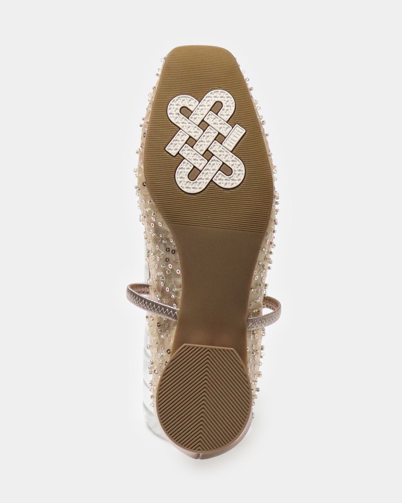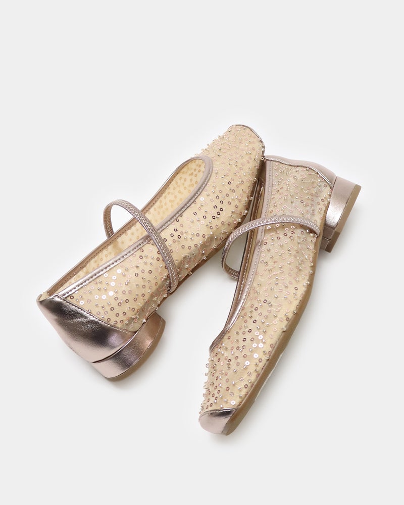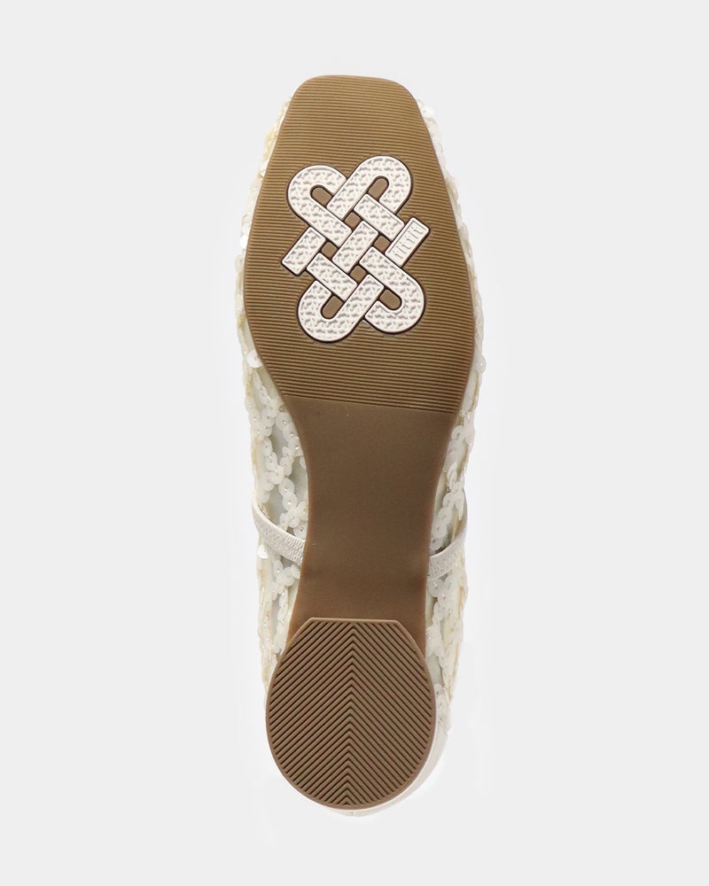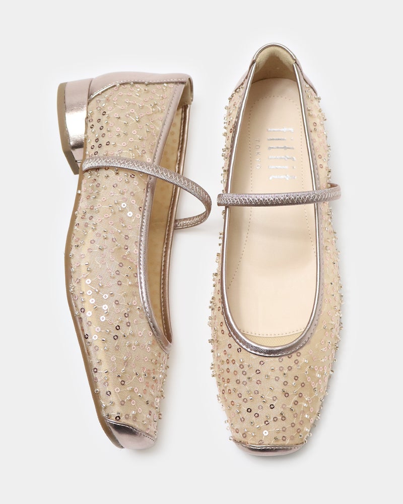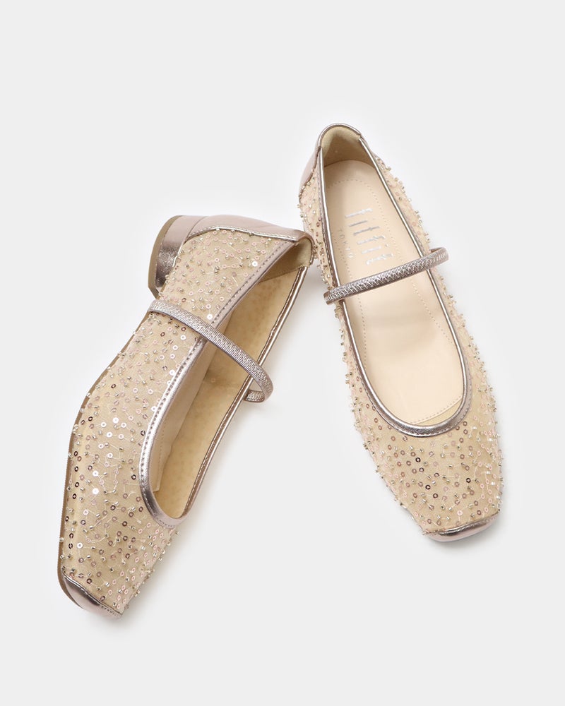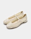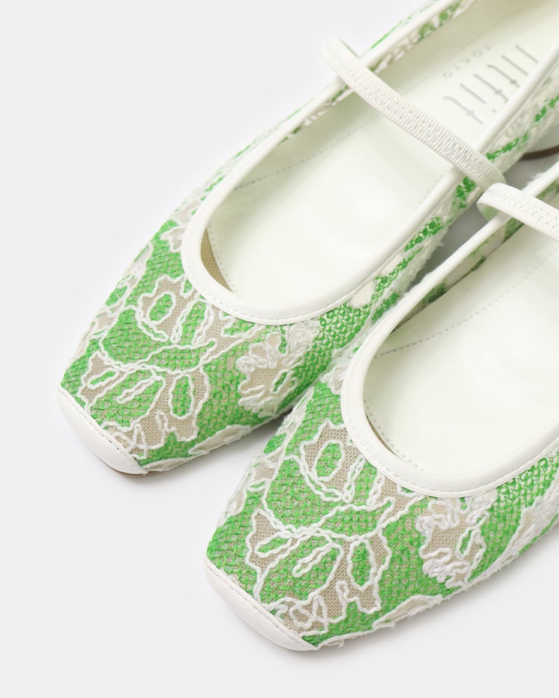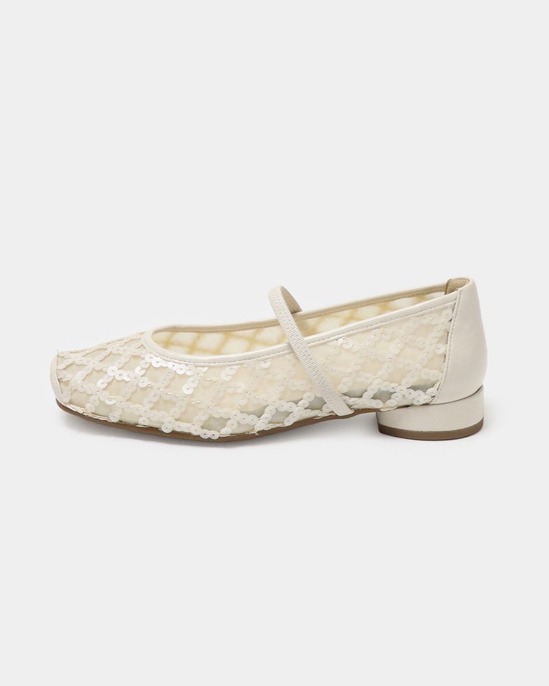 「履くだけで映える」万能フラットシューズが登場。 華やかさと汎用性を兼ね備えた「履くだけで映える」万能フラットシューズ。 ヒールに頼らずとも「きちんと感」と華やかさを両立できるよう設計されており、デイリーユースからオフィス、さらには少し特別な日まで幅広く対応できる一足です。 繊細なグリッターやスパンコールを採用することで「フラット=地味」という課題を解消し、足元にときめきを添えるデザインに。 木型には、指まわりに高さのある人気ものをベースに、今のボトムスバランスにマッチするようスマートに改良された新しい木型を採用しました。 アウトソールはオリジナルのエンブレム入りラバーソールと、独立した卵型ヒールを組み合わせ、完全なフラットではなく適度な傾斜をつけることで、スタイルアップとスムーズな足の蹴り出しをサポートします。 インソールには、中足骨部分と土踏まずをしっかり支える形状を採用し、表面の前方には抗菌防臭メッシュ、後方には前滑りを防ぐノンスリップ加工の合成皮革を配することで、快適な靴内環境と長時間の歩行でも疲れにくい構造を追求しました。 アッパーは主張しすぎず程よいホールド感を与える華奢なシャーリングベルトをあしらい、甲をすっきり見せながらフィット感を高めています。 素材バリエーションも豊富で、貝殻のようなスパンコール刺繍を施したエクリュ、上品なグレーミックス、夜空の星座のようなビーズ表現がラグジュアリーなライトモカ、そしてボタニカル柄が爽やかなライムなど、 個性が光るラインナップからお好みの1足をお選びいただけます。 軽量かつクッション性に優れた設計により、履いた瞬間に心地よさを実感できるだけでなく、お洋服をシンプルにまとめることで靴が持つ「大人の可愛らしさ」がより一層引き立ちます。 見た目の美しさと快適な履き心地を高い次元でバランスさせた、春夏シーズンの主役となる一足です。