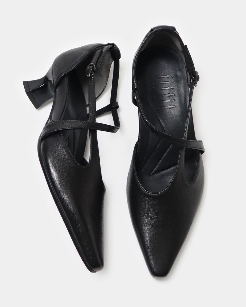 見た目はモード、履き心地は想像以上のクオリティを実現。 fitfitの「快適ヒールカップシリーズ」から新作のオープンタイプパンプスが登場しました。 「ヒールは疲れる」という固定概念を覆すべく、美しさと実用性を両立させた一足。 最大の特徴は、独自の立体的な木型を採用した全く新しいフットベッド構造にあります。 踵や土踏まずのアーチをしっかり支える設計により、前滑りを防いで踵に重心が乗る感覚を生み出し、ハイヒールから遠ざかっていた方でも長時間快適に着用いただけます。 つま先はエレガントな細身のスクエア形状で、長めのトゥ先がエッジを効かせつつ、内部では指先を解放するコンフォータブルな履き心地を叶えました。 アウトソールにはグリップ性に優れた軽量ラバーを使用し、スタイリッシュな薄さと屈曲性・衝撃吸収性を両立。 トレンドのくびれのある華奢なヒールを組み合わせることで、洗練されたおしゃれ感を演出します。 インソールの踵部分はカップ状になっており、底に敷いたクッションと効果的なステッチングが快適度を高めます。 アッパーには、魅力的なシボ感と艶感を持つゴードレザー(山羊革)を使用し、サイドオープンのデザインは軽やかな肌見せを叶えつつ、外反母趾などで気になる拇指や小指の付け根はしっかりカバーする設計です。 斜めの甲ストラップがホールド感を高め、ベルト付け根のゴム仕様によりバックルを外さず簡単に着脱できるのも嬉しいポイント。 サイドの抜け感により窮屈さが少ないため、夕方に足がむくみやすい方にも最適です。 オケージョンシーンや歩く機会の多い仕事靴としてもおすすめです。