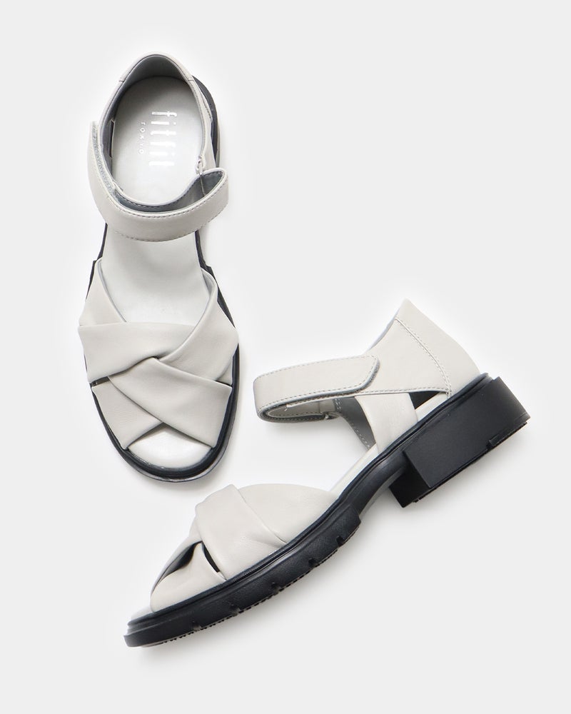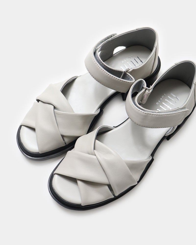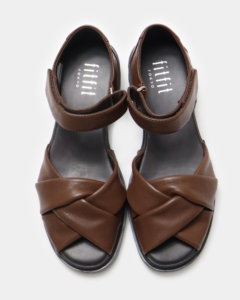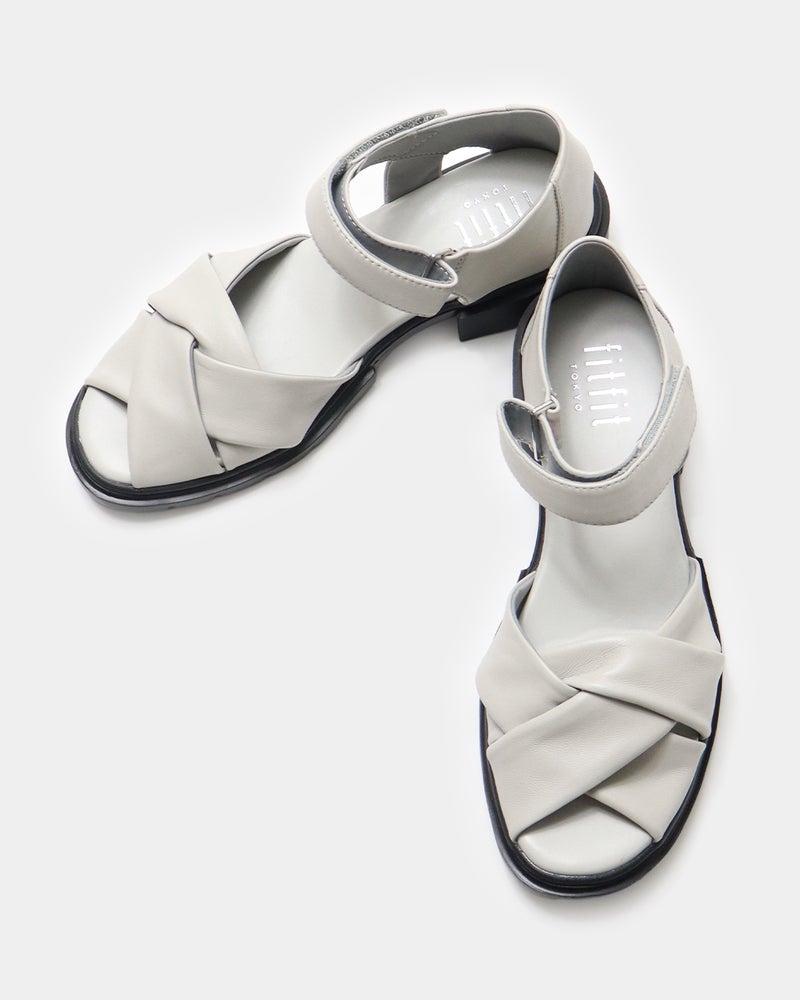 包まれるような柔らかさ。きちんと見えするレザーサンダル 柔らかなレザーが足をやさしく包み込み、上品な印象に仕上げたレザーサンダル。 サンダルでありながら露出を抑えたデザインは、きれいめスタイルにも合わせやすい一足で、つま先とかかとをほどよくカバーし、安定感のある履き心地と大人らしい足元を演出します。 ゆとりのある足入れながらも足元をすっきり見せ、快適さと美しさを両立し、約3.5cmのヒールと程よいボリュームソールで、自然なスタイルアップも叶えます。 ソールにはfitfit独自のクッション構造を採用することで前足部分のクッションが歩くときの衝撃をやわらげ、かかと部分のラバーが滑りにくく安定した歩き心地をサポートします。 アッパーは上質でやわらかなレザーを使用したクロスデザイン。 足を包み込むようなフィット感があり、足が前に滑りにくい設計。 かかともやさしく覆うデザインで安定感があり、「かかとを出したくない」という方にもおすすめ。 アンクルベルトで着脱も簡単な、上品さと歩きやすさを兼ね備えたサンダルです。