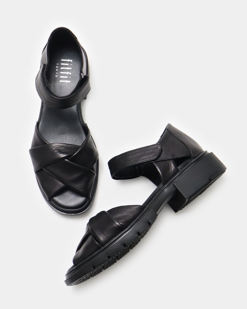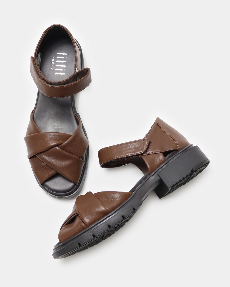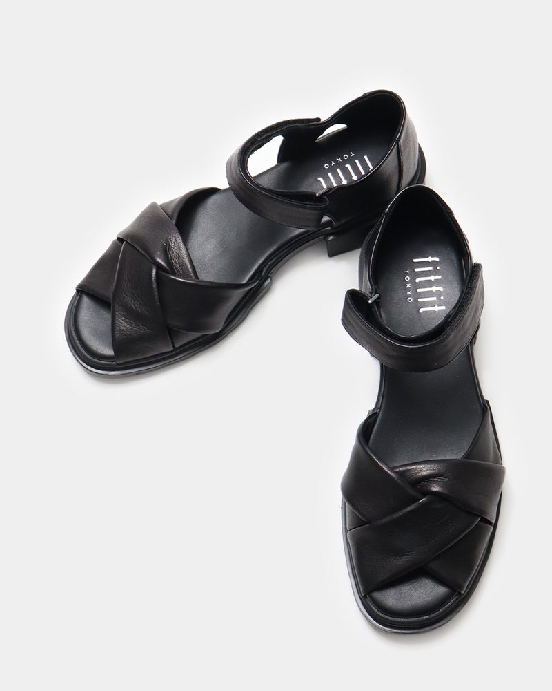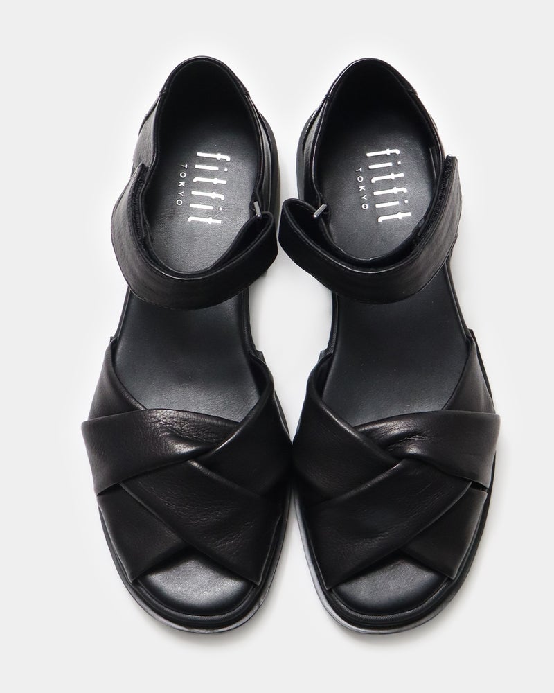 包まれるような柔らかさ。きちんと見えするレザーサンダル 柔らかなレザーが足をやさしく包み込み、上品な印象に仕上げたレザーサンダル。 サンダルでありながら露出を抑えたデザインは、きれいめスタイルにも合わせやすい一足で、つま先とかかとをほどよくカバーし、安定感のある履き心地と大人らしい足元を演出します。 ゆとりのある足入れながらも足元をすっきり見せ、快適さと美しさを両立し、約3.5cmのヒールと程よいボリュームソールで、自然なスタイルアップも叶えます。 ソールにはfitfit独自のクッション構造を採用することで前足部分のクッションが歩くときの衝撃をやわらげ、かかと部分のラバーが滑りにくく安定した歩き心地をサポートします。 アッパーは上質でやわらかなレザーを使用したクロスデザイン。 足を包み込むようなフィット感があり、足が前に滑りにくい設計。 かかともやさしく覆うデザインで安定感があり、「かかとを出したくない」という方にもおすすめ。 アンクルベルトで着脱も簡単な、上品さと歩きやすさを兼ね備えたサンダルです。