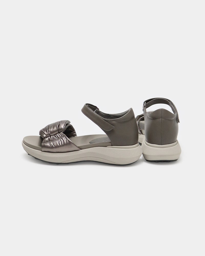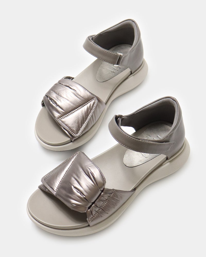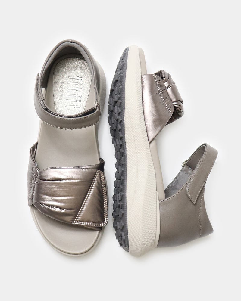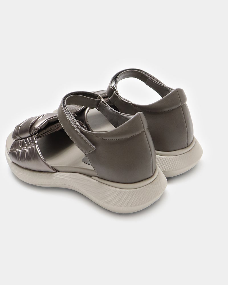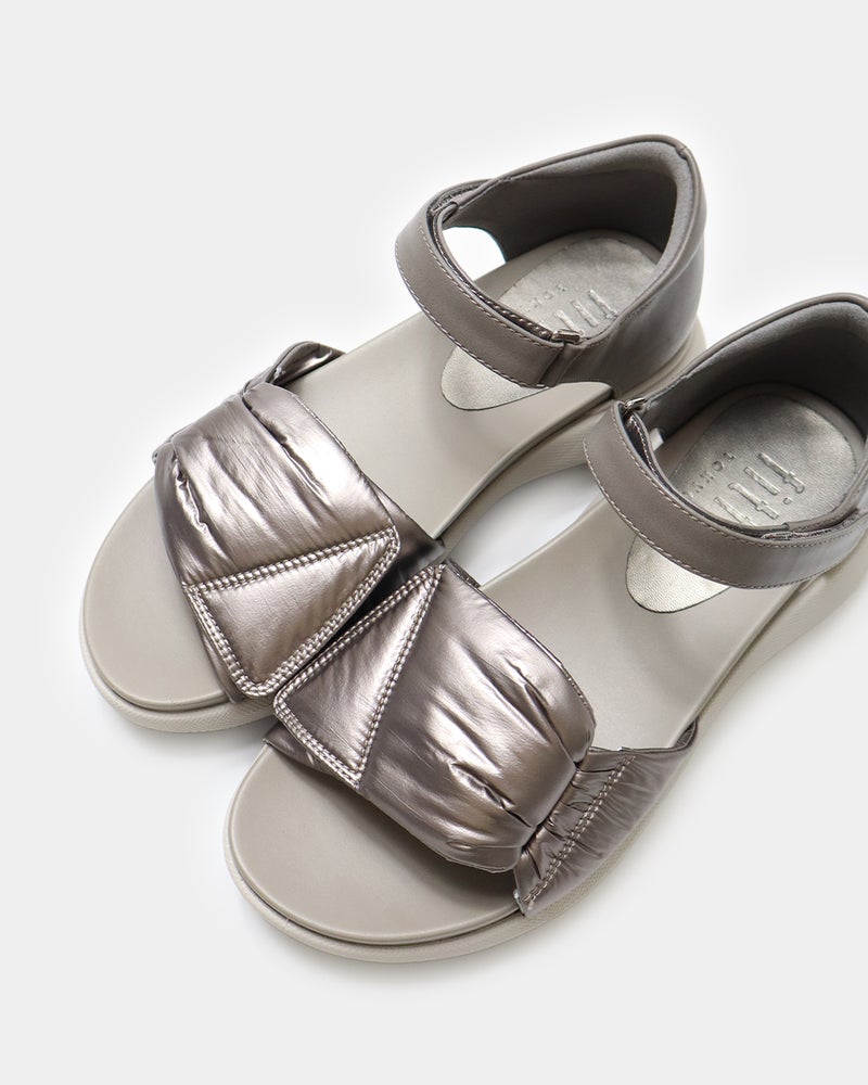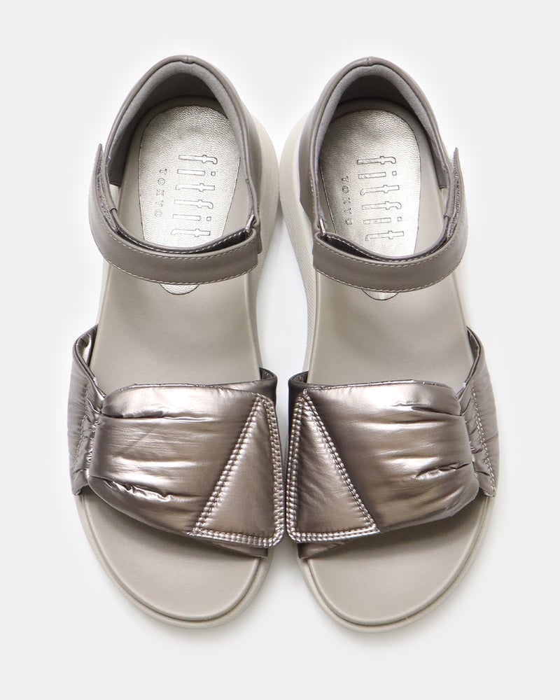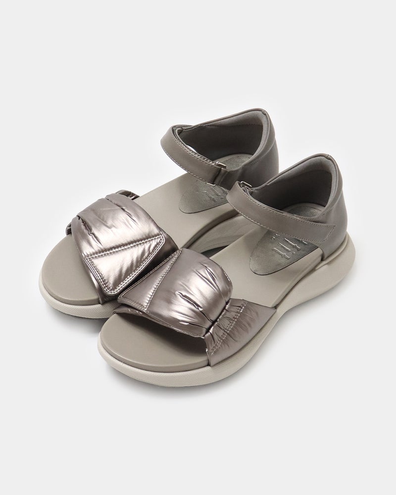 スイスイ歩けてスタイルアップが叶う大人の上品スポーティサンダル。 安定感のある厚底ソールで、見た目以上に歩きやすい厚底パデットサンダル。 トレンドのスポーティな要素を取り入れつつ、程よい丸みのあるフォルムと微光沢の素材感で、大人の女性が上品に履きこなせる一足に仕上げました。 甲を覆うふっくらとしたパフィーデザインは、足指の形を優しくカバーしてくれます。 一枚ベルトのように見えて、実はベルクロ(マジックテープ)仕様になっており、夕方になって足がむくんだ時でも、締め付け感をサッと自由に調整できる画期的なデザインです。 指先を締め付けない上品なオブリークトゥ(親指から小指にかけて斜めにカット)と、約4cmで実感ヒール約2cmの軽量厚底ソールで、スタイルアップしながら1日中疲れにくい、弾むような履き心地を実現しました。 立体インソールは汚れをサッと拭き取れる素材を採用し、汗ばむ季節もいつでも快適です。 上品な光沢感があるので靴だけがカジュアルに浮いてしまうことがなく、きれいめスタイルのハズシにも最適。 流行のバレルパンツやジャケットスタイル、柔らかな色味のコーディネートまで、幅広いシーンで活躍します。
