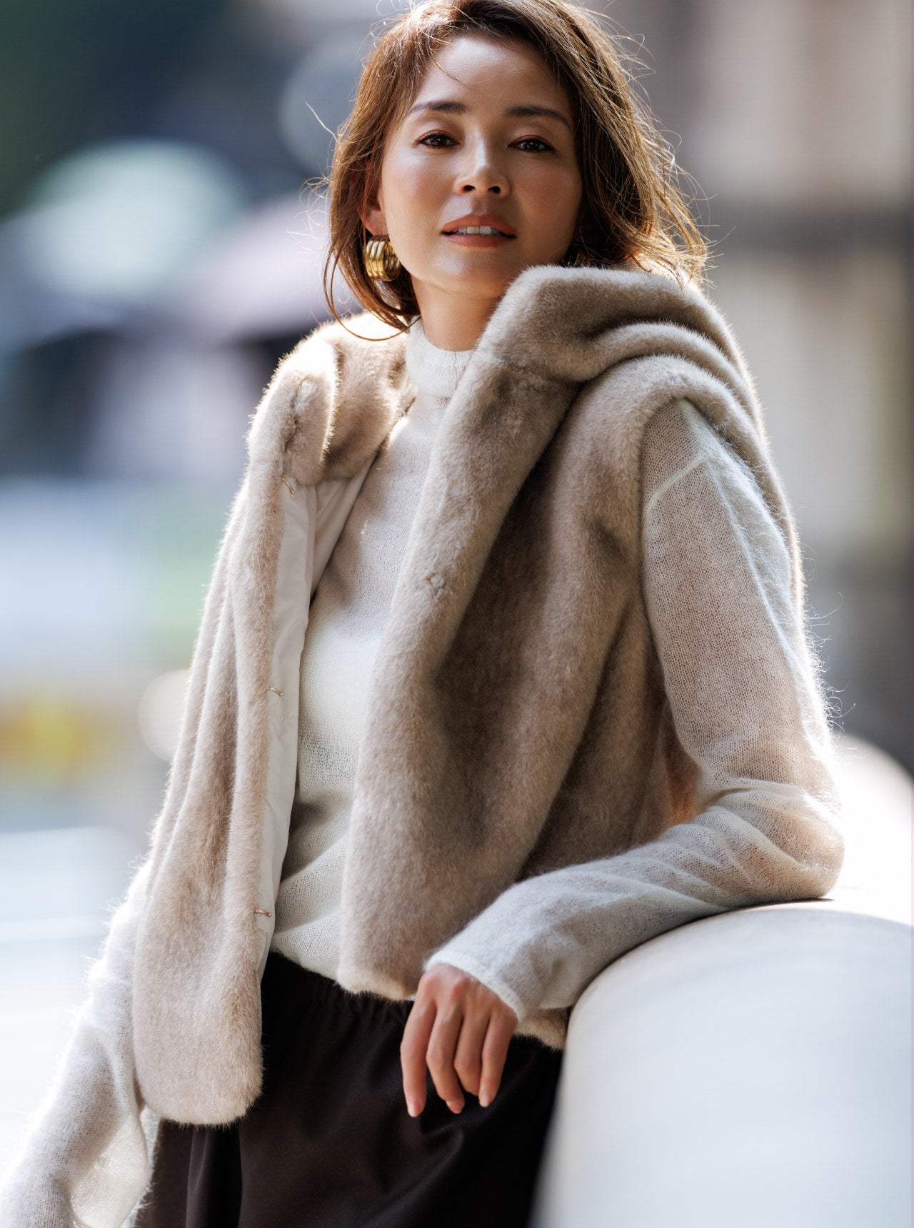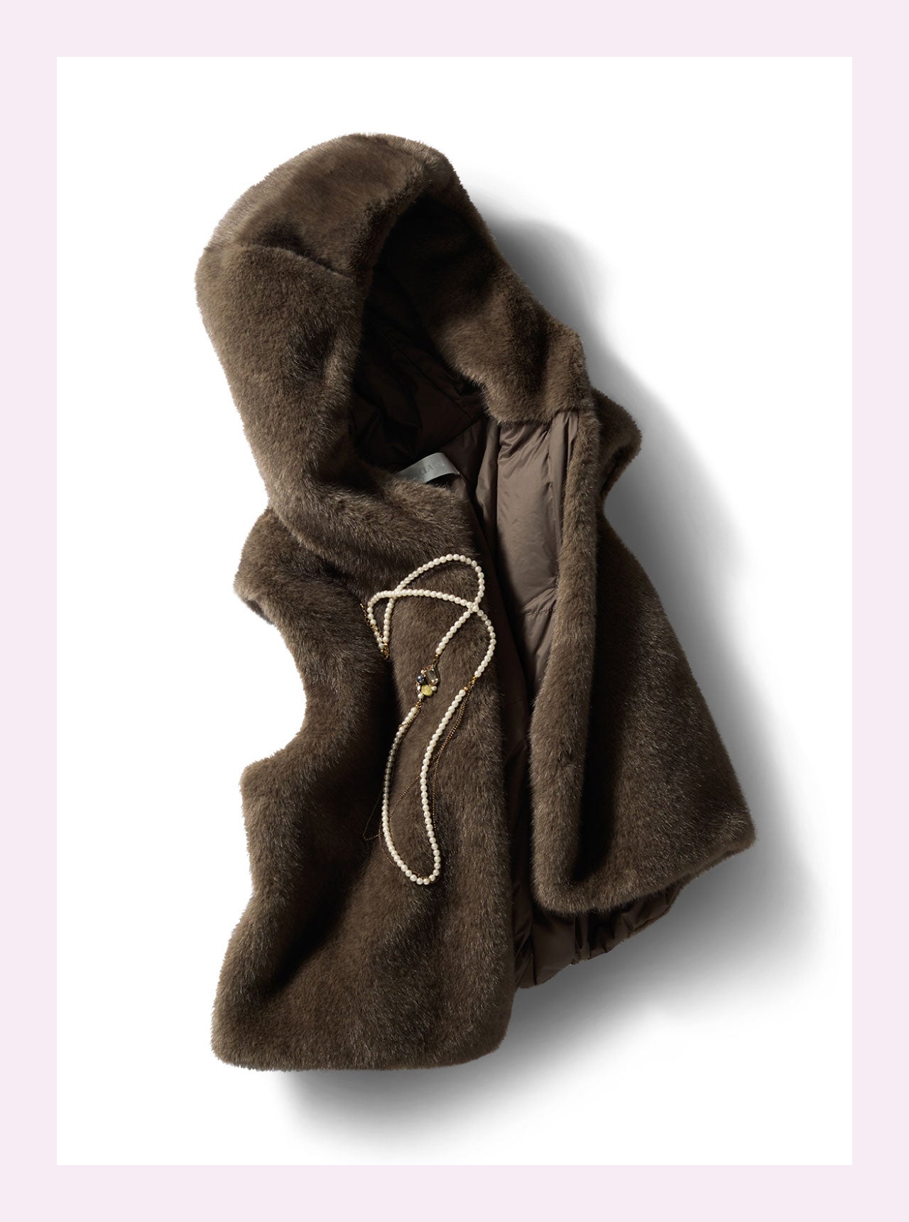 秋は1枚で、冬はコートインで。お洒落のアクセントと防寒の両方を叶えてくれるのが、こんなミンクタッチファーのフードジレ。首まわりをふんわり覆うスタンドカラー風のネックデザインや、やや短めのコンパクト丈でバランスよく着こなせるファーアイテムに仕立てました。